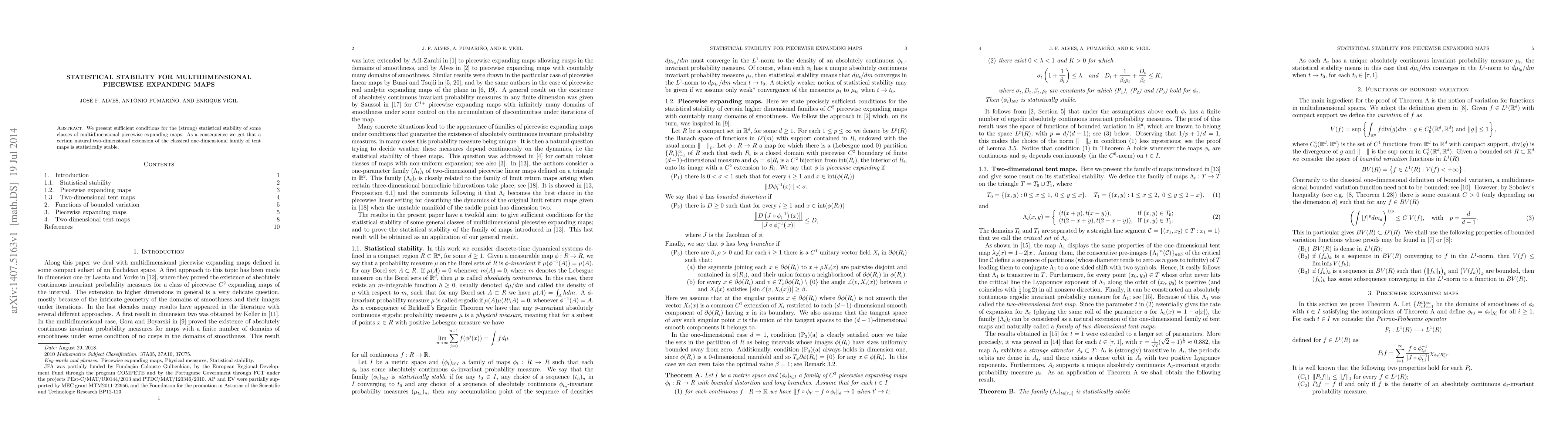 This paper provides conditions for statistical stability in multidimensional piecewise expanding maps, demonstrating that a two-dimensional extension of the one-dimensional tent maps family exhibits this stability.