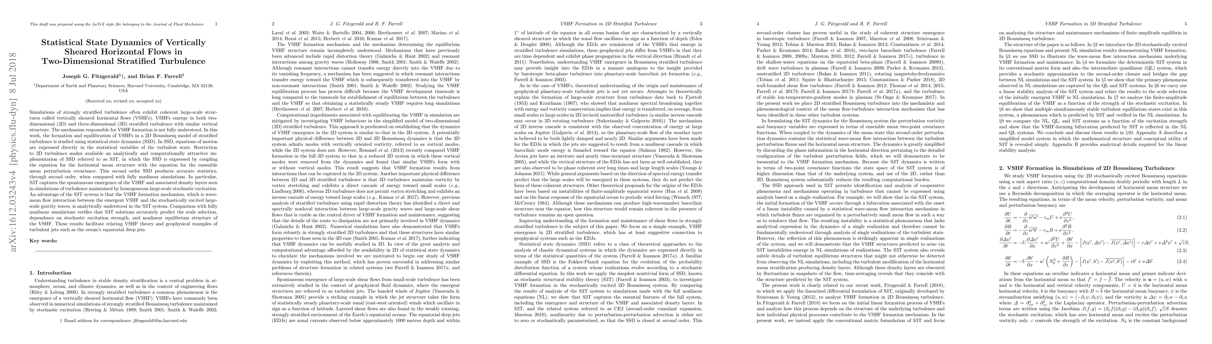 This paper studies the formation and equilibration of vertically sheared horizontal flows (VSHFs) in two-dimensional stratified turbulence using statistical state dynamics (SSD). The S3T method, a second-order SSD, accurately predicts the VSHF's scale selection, dependence on excitation strength, and equilibrium structure, providing insights into the wave-mean flow interaction mechanism.