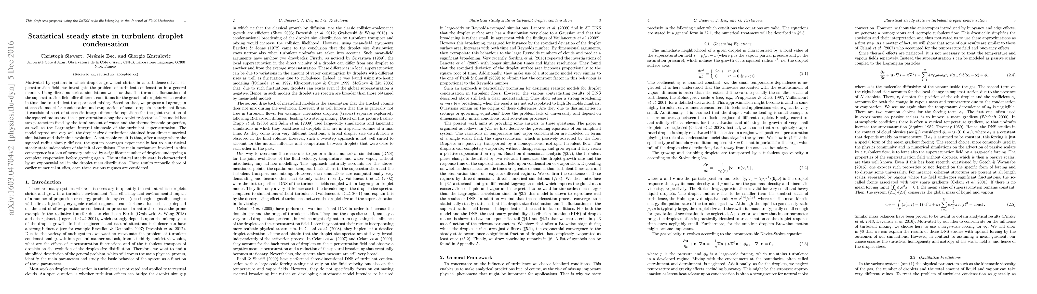 This paper investigates turbulent droplet condensation using direct numerical simulations and proposes a Lagrangian stochastic model that accurately reproduces droplet size distributions. The model reveals that the system converges to a statistical steady state characterized by an exponential tail in the droplet mass distribution, driven by droplet evaporation and growth dynamics in turbulent fields.