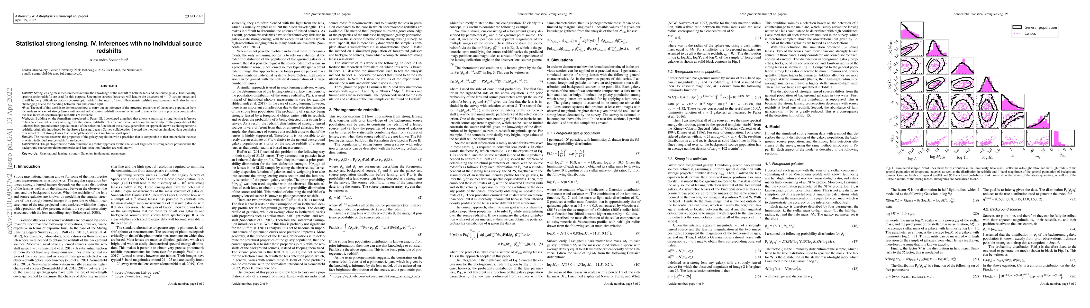 Context. Strong lensing mass measurements require the knowledge of the redshift of both the lens and the source galaxy. Traditionally, spectroscopic redshifts are used for this purpose. Upcoming surveys, however, will lead to the discovery of $\sim10^5$ strong lenses, and it will be very difficult to obtain spectroscopic redshifts for most of them. Photometric redshift measurements will also be very challenging, due to the blending between lens and source light. Aims. The goal of this work is to demonstrate how to carry out an inference of the structural properties of the galaxy population from the analysis of a set of strong lenses with no individual source redshift measurements, and to assess the loss in precision compared to the case in which spectroscopic redshifts are available. Methods. Building on the formalism introduced in Paper III, I developed a method that allows to carry out a statistical strong lensing inference while marginalising over the source redshifts. This method, which relies on the knowledge of the properties of the unlensed background source population and of the selection function of the survey, generalises an approach known as photogeometric redshift, originally introduced by the Strong Lensing Legacy Survey collaboration. I tested the method on simulated data consisting of a subset of 137 strong lenses that is complete above a cut in observational space. Results. The method recovers the properties of the galaxy population, with a precision that is comparable to that attainable in the case in which individual source redshifts are known. Conclusions. The photogeometric redshift method is a viable approach for the analysis of large sets of strong lenses, provided that the background source population properties and lens selection function are well-known.