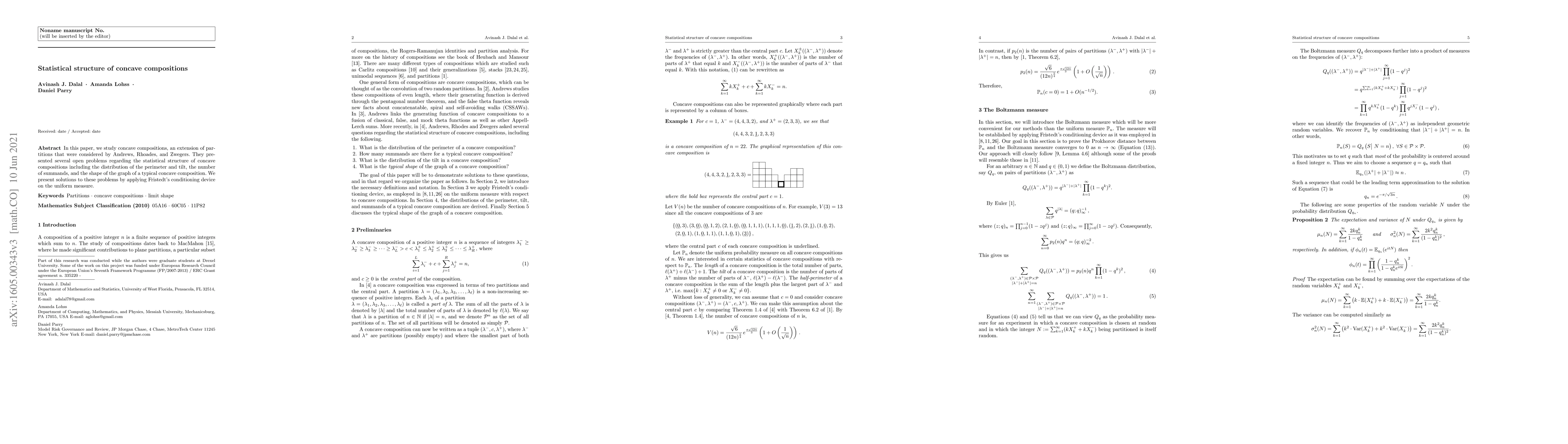 In this paper, we study concave compositions, an extension of partitions that were considered by Andrews, Rhoades, and Zwegers. They presented several open problems regarding the statistical structure of concave compositions including the distribution of the perimeter and tilt, the number of summands, and the shape of the graph of a typical concave composition. We present solutions to these problems by applying Fristedt's conditioning device on the uniform measure.