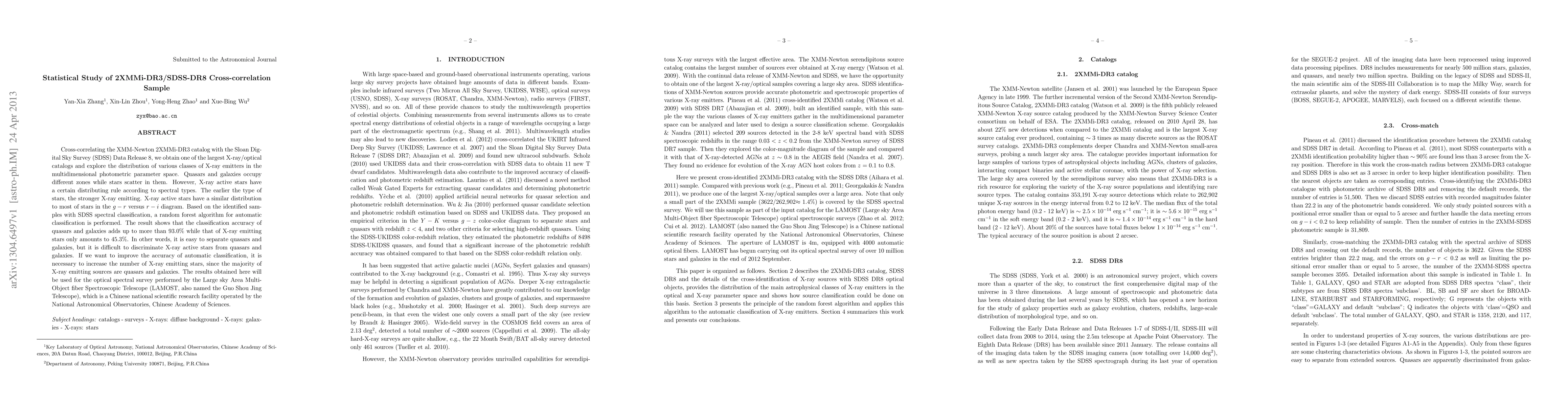 Cross-correlating the XMM-Newton 2XMMi-DR3 catalog with the Sloan Digital Sky Survey (SDSS) Data Release 8, we obtain one of the largest X-ray/optical catalogs and explore the distribution of various classes of X-ray emitters in the multidimensional photometric parameter space. Quasars and galaxies occupy different zones while stars scatter in them. However, X-ray active stars have a certain distributing rule according to spectral types. The earlier the type of stars, the stronger X-ray emitting. X-ray active stars have a similar distribution to most of stars in the g-r versus r-i diagram. Based on the identified samples with SDSS spectral classification, a random forest algorithm for automatic classification is performed. The result shows that the classification accuracy of quasars and galaxies adds up to more than 93.0% while that of X-ray emitting stars only amounts to 45.3%. In other words, it is easy to separate quasars and galaxies, but it is difficult to discriminate X-ray active stars from quasars and galaxies. If we want to improve the accuracy of automatic classification, it is necessary to increase the number of X-ray emitting stars, since the majority of X-ray emitting sources are quasars and galaxies. The results obtained here will be used for the optical spectral survey performed by the Large sky Area Multi-Object fiber Spectroscopic Telescope (LAMOST, also named the Guo Shou Jing Telescope), which is a Chinese national scientific research facility operated by the National Astronomical Observatories, Chinese Academy of Sciences.
