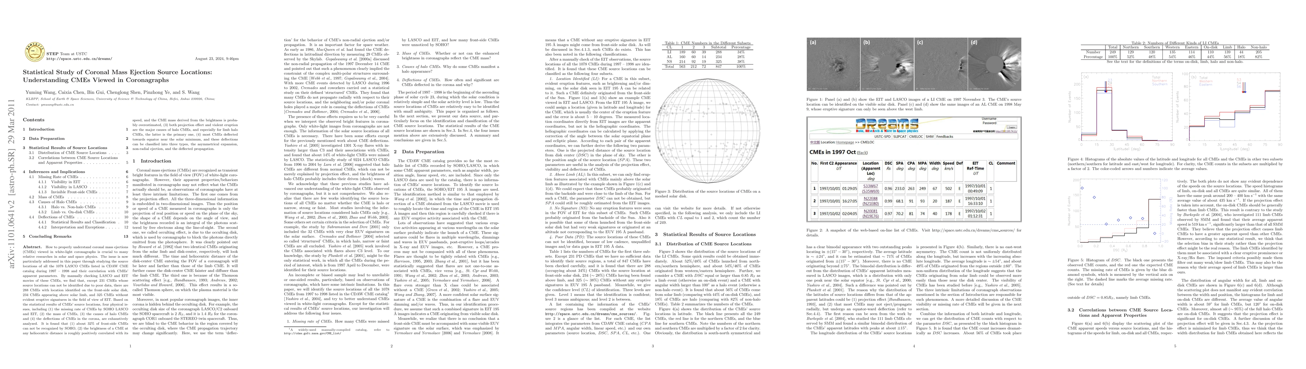 This study examines the source locations of 1078 CMEs observed by LASCO during 1997-1998, identifying 288 front-side, 234 limb, and 325 non-eruptive CMEs. It analyzes four physical issues, revealing significant insights into CME detection, mass estimation, causes of halo CMEs, and CME deflections near solar minimum.