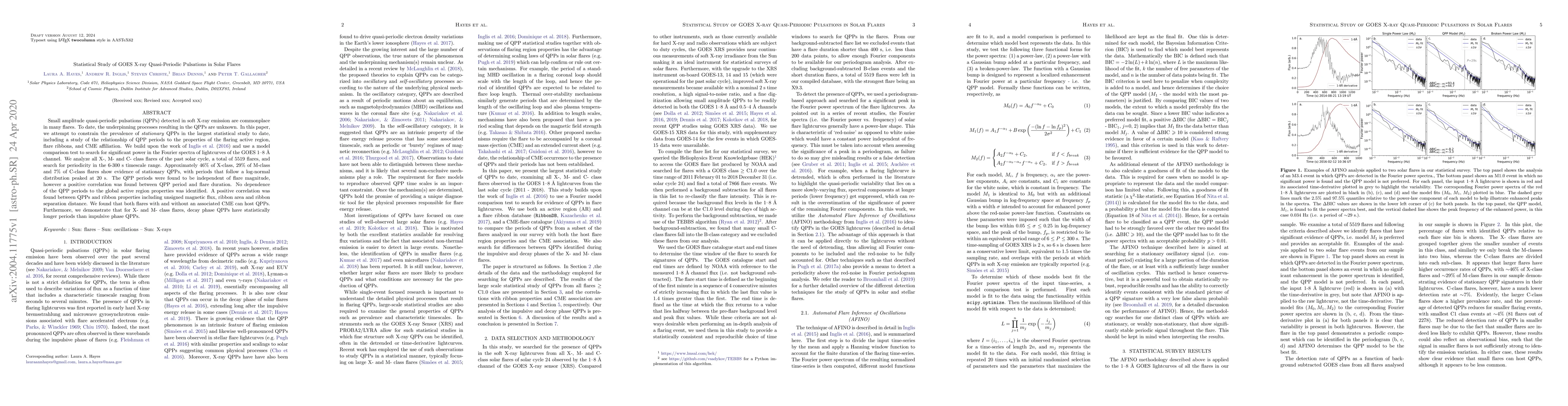 This paper statistically analyzes quasi-periodic pulsations (QPPs) in GOES X-ray flares, finding that approximately 46% of X-class, 29% of M-class, and 7% of C-class flares exhibit stationary QPPs, with periods peaking at 20 seconds. QPP periods correlate positively with flare duration but not with flare magnitude.