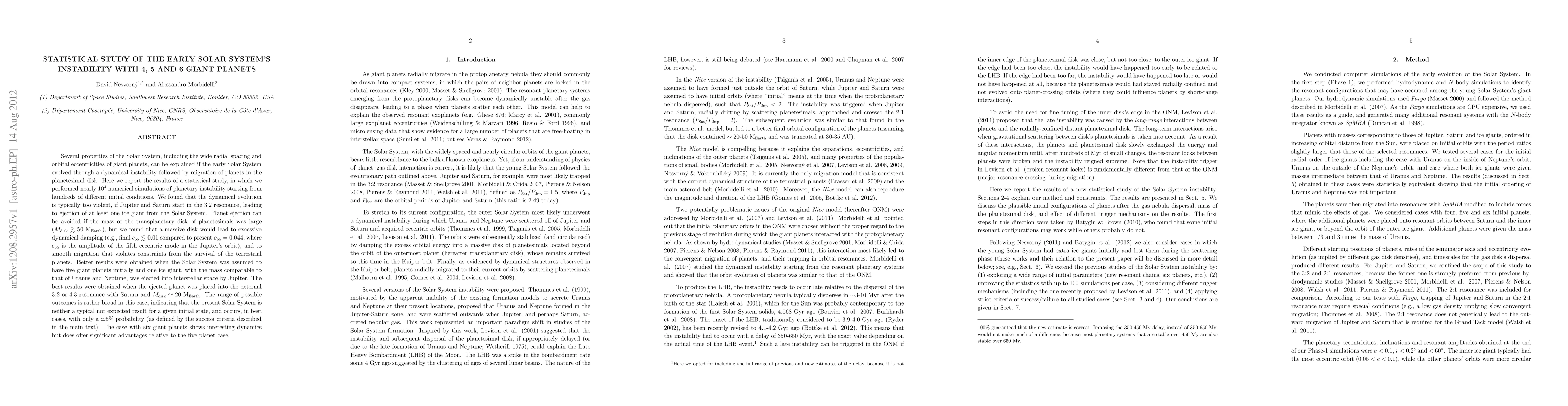 This study investigates the dynamical instability of the early Solar System with 4, 5, or 6 giant planets, finding that a scenario with five initial giants and one ice giant ejected leads to the best match with current Solar System properties, though such outcomes occur with only ~5% probability. The presence of a massive planetesimal disk can mitigate ejections but leads to excessive damping and migration that conflicts with terrestrial planet survival.