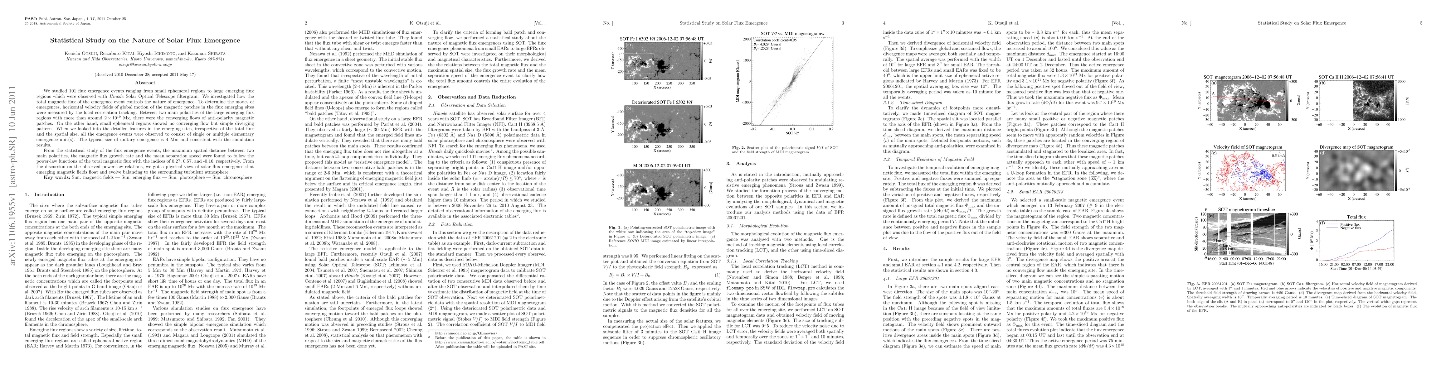 We studied 101 flux emergence events ranging from small ephemeral regions to large emerging flux regions which were observed with Hinode Solar Optical Telescope filtergram. We investigated how the total magnetic flux of the emergence event controls the nature of emergence. To determine the modes of emergences, horizontal velocity fields of global motion of the magnetic patches in the flux emerging sites were measured by the local correlation tracking. Between two main polarities of the large emerging flux regions with more than around 2 \times 10^19 Mx, there were the converging flows of anti-polarity magnetic patches. On the other hand, small ephemeral regions showed no converging flow but simple diverging pattern. When we looked into the detailed features in the emerging sites, irrespective of the total flux and the spatial size, all the emergence events were observed to consist of single or multiple elementary emergence unit(s). The typical size of unitary emergence is 4 Mm and consistent with the simulation results. From the statistical study of the flux emergence events, the maximum spatial distance between two main polarities, the magnetic flux growth rate and the mean separation speed were found to follow the power-law functions of the total magnetic flux with the indices of 0.27, 0.57, and -0.16, respectively. From the discussion on the observed power-law relations, we got a physical view of solar flux emergence that emerging magnetic fields float and evolve balancing to the surrounding turbulent atmosphere. Key words: Sun: magnetic fields - Sun: emerging flux - Sun: photosphere - Sun: chromosphere