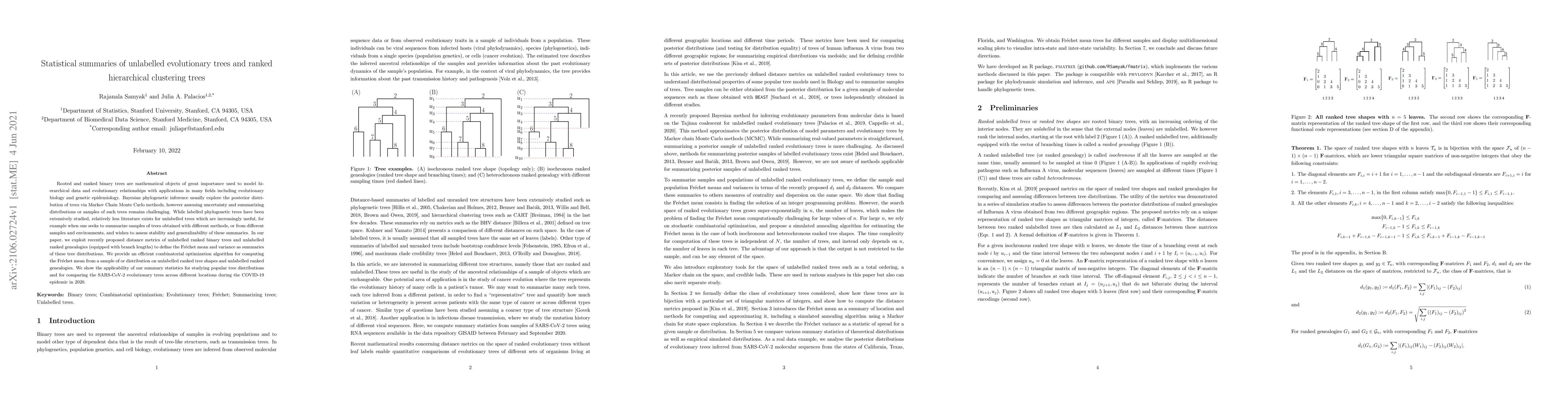 This paper proposes statistical summaries for unlabelled evolutionary and hierarchical clustering trees using Frechet mean and variance based on new distance metrics. It introduces an efficient algorithm for calculating these summaries and demonstrates their utility in comparing SARS-CoV-2 evolutionary trees during the COVID-19 pandemic.