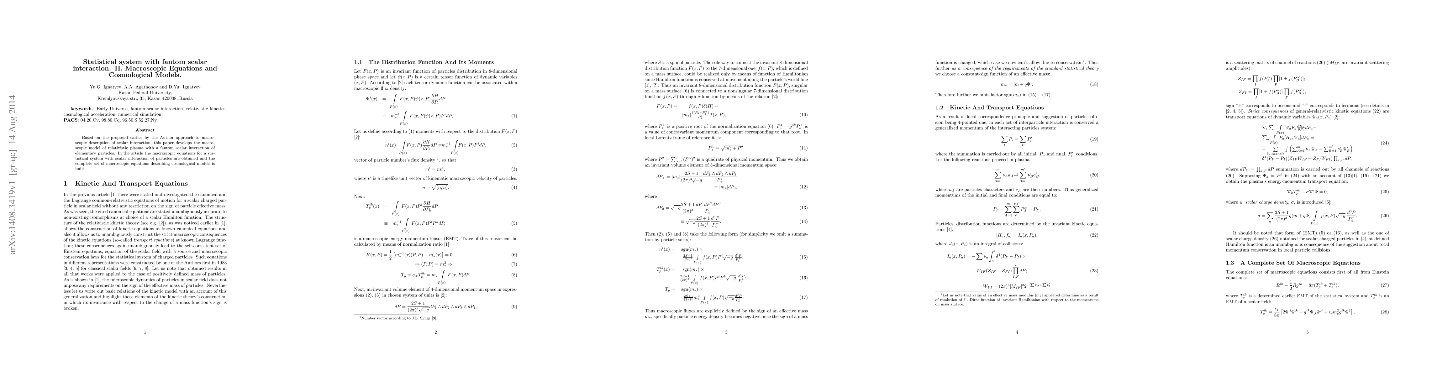 This paper extends the author's previous work on macroscopic scalar interaction, deriving equations for a relativistic plasma with fantom scalar particle interaction. It builds a comprehensive set of macroscopic equations applicable to cosmological models.