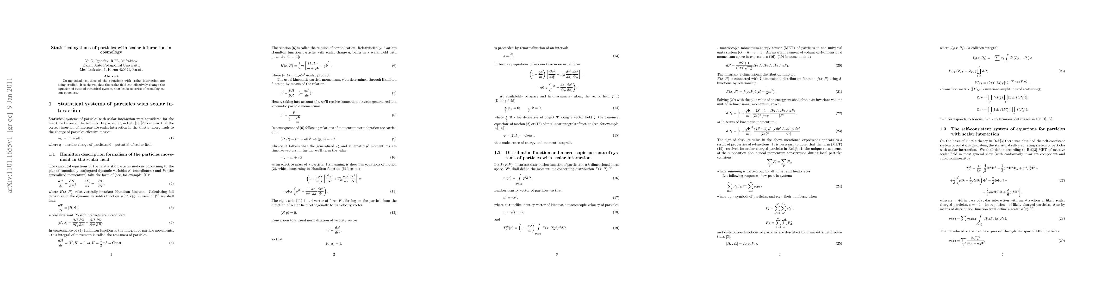 Cosmological solutions of the equations with scalar interaction are being studied. It is shown, that the scalar field can effectively change the equation of state of statistical system, that leads to series of cosmological consequences.