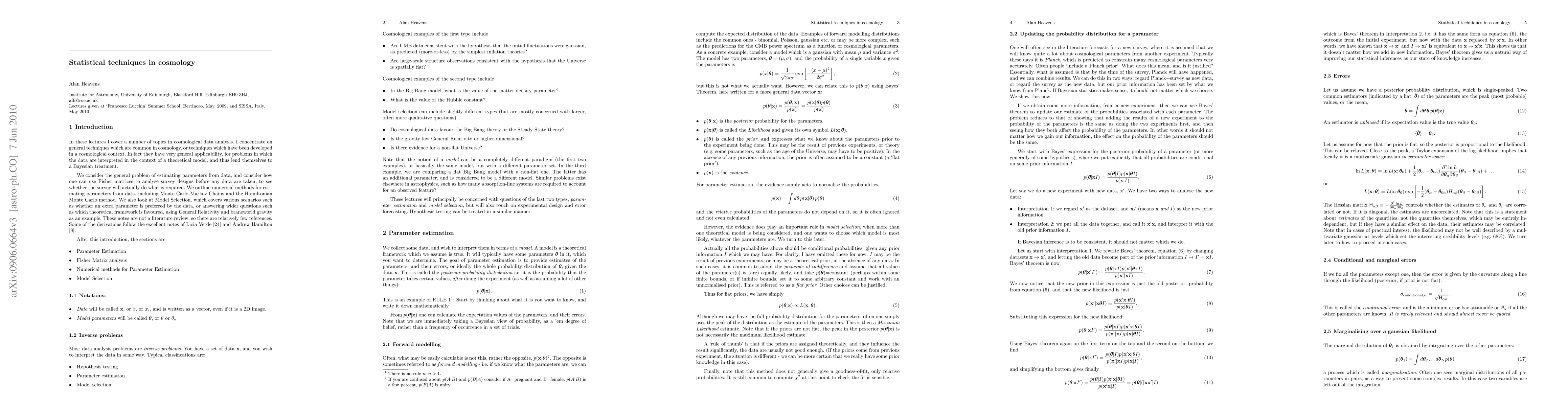This research paper discusses statistical techniques used in cosmology, including parameter estimation, survey design analysis, and model selection methods, with a focus on their general applicability to various scientific contexts.