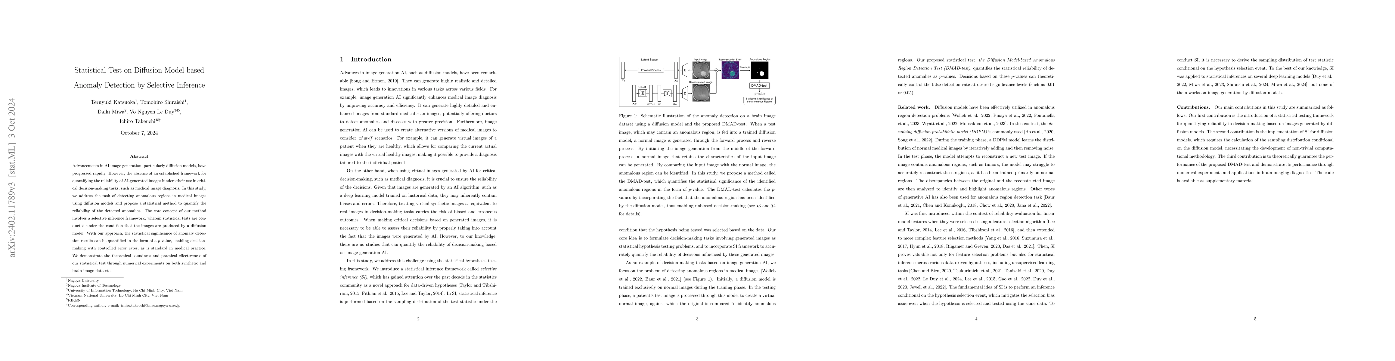 The enhanced performance of AI has accelerated its integration into scientific research. In particular, the use of generative AI to create scientific hypotheses is promising and is increasingly being applied across various fields. However, when employing AI-generated hypotheses for critical decisions, such as medical diagnoses, verifying their reliability is crucial. In this study, we consider a medical diagnostic task using generated images by diffusion models, and propose a statistical test to quantify its reliability. The basic idea behind the proposed statistical test is to employ a selective inference framework, where we consider a statistical test conditional on the fact that the generated images are produced by a trained diffusion model. Using the proposed method, the statistical reliability of medical image diagnostic results can be quantified in the form of a p-value, allowing for decision-making with a controlled error rate. We show the theoretical validity of the proposed statistical test and its effectiveness through numerical experiments on synthetic and brain image datasets.