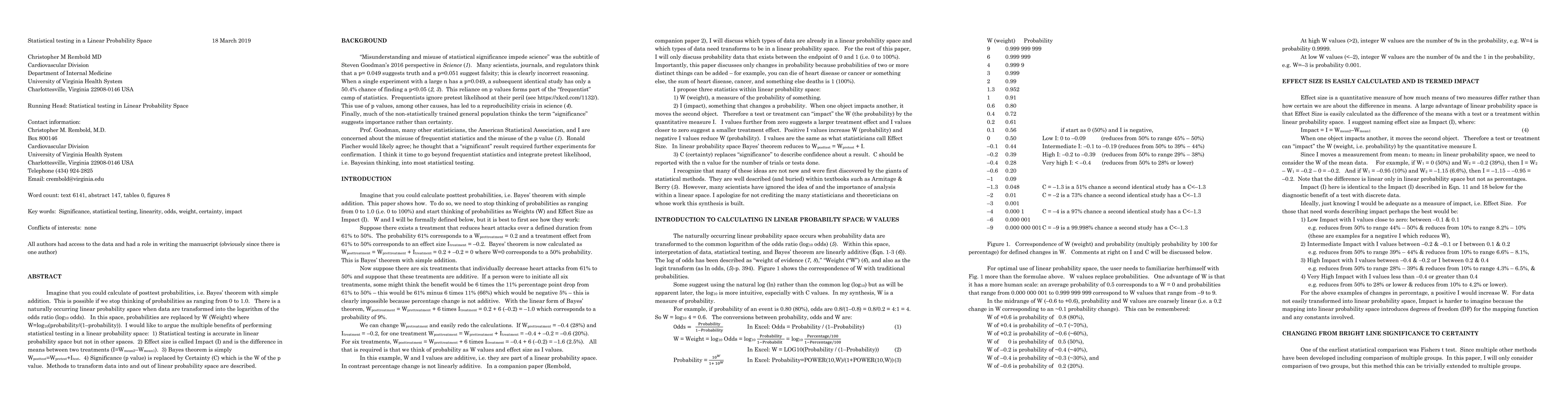 Imagine that you could calculate of posttest probabilities, i.e. Bayes theorem with simple addition. This is possible if we stop thinking of probabilities as ranging from 0 to 1.0. There is a naturally occurring linear probability space when data are transformed into the logarithm of the odds ratio (log10 odds). In this space, probabilities are replaced by W (Weight) where W=log10(probability/(1-probability)). I would like to argue the multiple benefits of performing statistical testing in a linear probability space: 1) Statistical testing is accurate in linear probability space but not in other spaces. 2) Effect size is called Impact (I) and is the difference in means between two treatments (I=Wmean2-Wmean1). 3) Bayes theorem is simply Wposttest=Wpretest+Itest. 4) Significance (p value) is replaced by Certainty (C) which is the W of the p value. Methods to transform data into and out of linear probability space are described.
