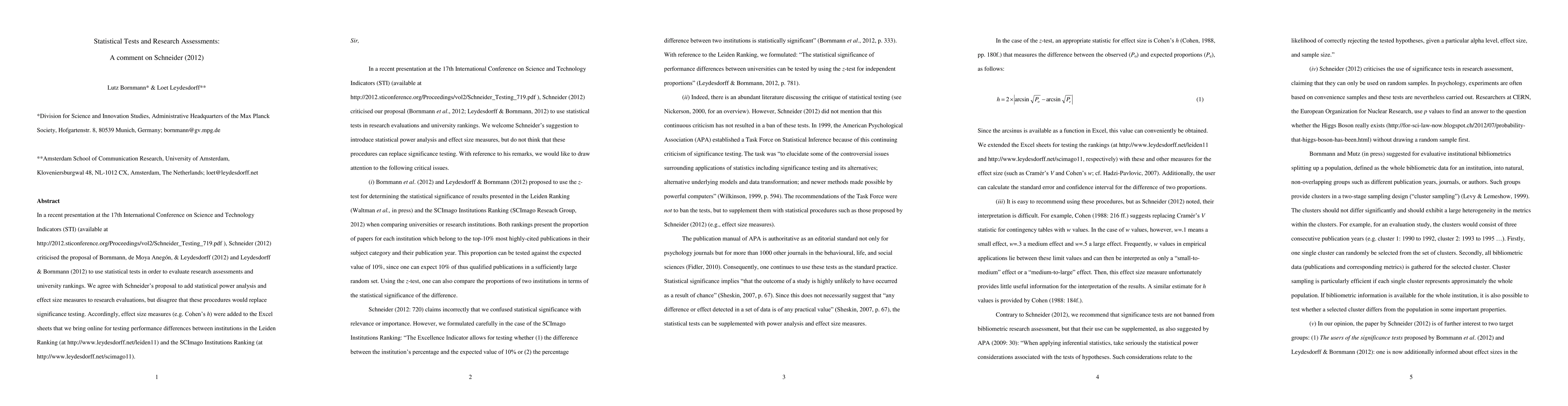 This paper responds to Schneider's (2012) critique of using statistical tests for evaluating research assessments, agreeing on the inclusion of statistical power analysis and effect size measures but opposing the replacement of significance testing. The authors have incorporated effect size measures in their online Excel sheets for Leiden and SCImago Institution Rankings to assess performance differences between institutions.