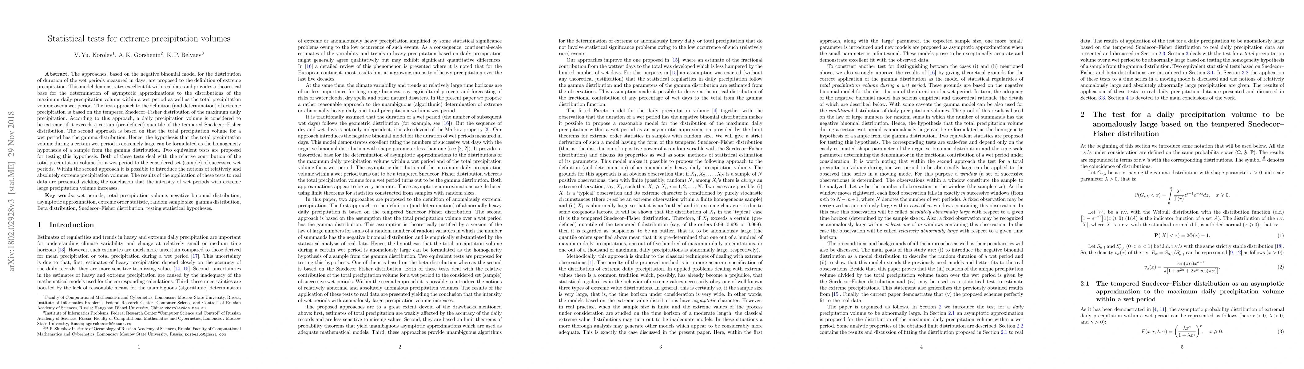 Researchers propose two approaches to define extreme precipitation: one based on the tempered Snedecor-Fisher distribution of daily maximum precipitation and another on the gamma distribution of total wet period volume. The study finds that intense wet periods with extremely large precipitation volumes have increased intensity.