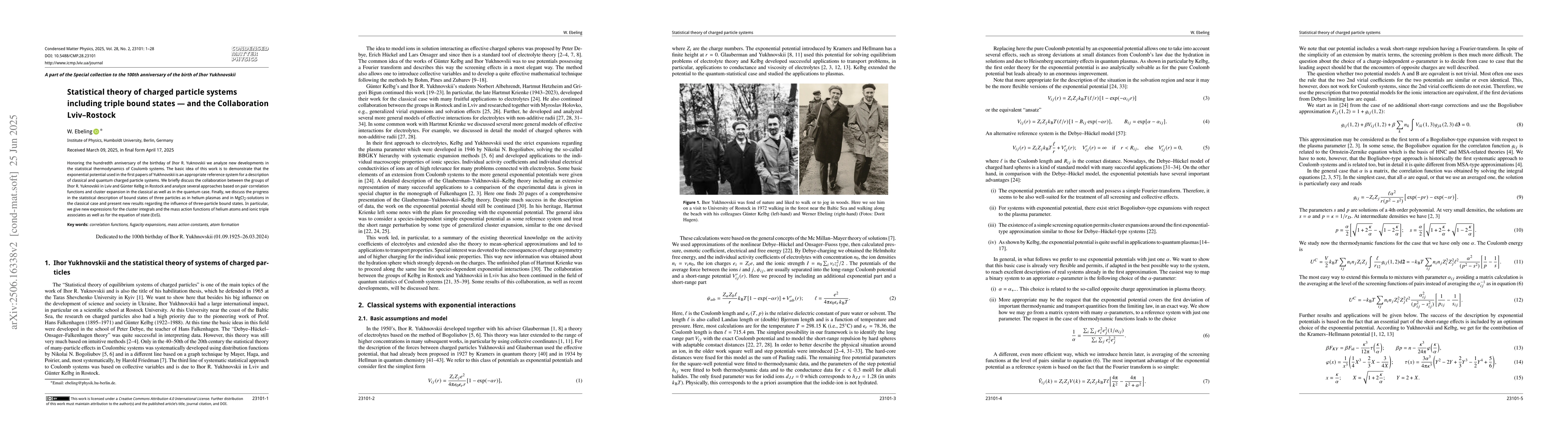 Honoring the hundredth anniversary of the birthday of Ihor R. Yuknovskii we analyze new developments in the statistical thermodynamics of Coulomb systems. The basic idea of this work is to demonstrate that the exponential potential used in the first papers of Yukhnovskii is an appropriate reference system for a description of classical and quantum charged particle systems. We briefly discuss the collaboration between the groups of Ihor R. Yuknovskii in Lviv and G\"unter Kelbg in Rostock and analyze several approaches based on pair correlation functions and cluster expansion in the classical as well as in the quantum case. Finally, we discuss the progress in the statistical description of bound states of three particles as in helium plasmas and in MgCl$_2$-solutions in the classical case and present new results regarding the influence of three-particle bound states. In particular, we give new expressions for the cluster integrals and the mass action functions of helium atoms and ionic triple associates as well as for the equation of state (EoS).