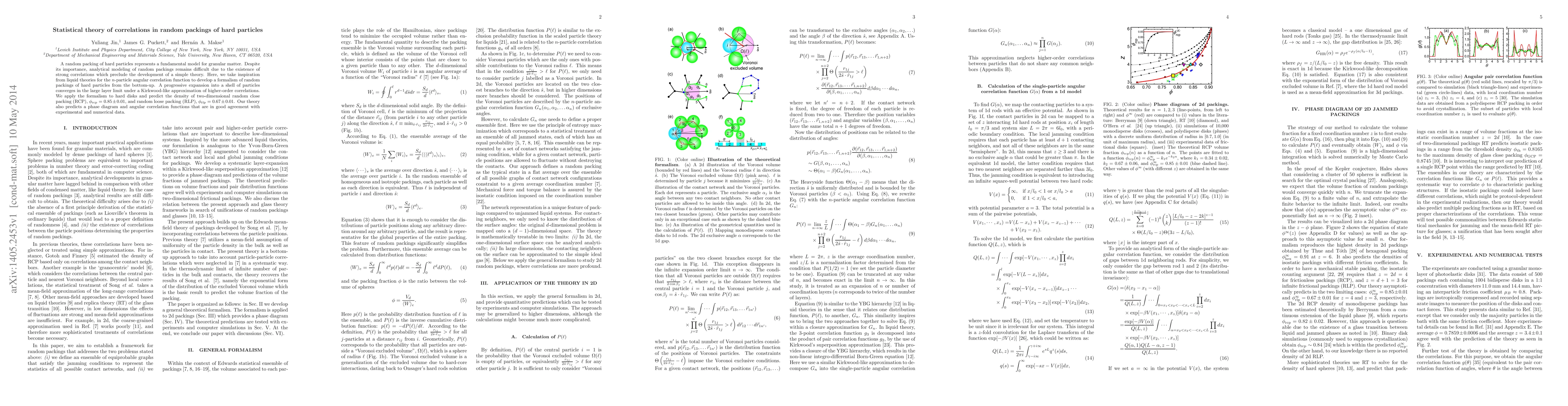 This paper develops a statistical theory for correlations in random packings of hard particles, proposing a formalism based on a progressive expansion and a Kirkwood-like approximation. The theory predicts densities for two-dimensional random close and loose packings, and aligns well with experimental and numerical data.
