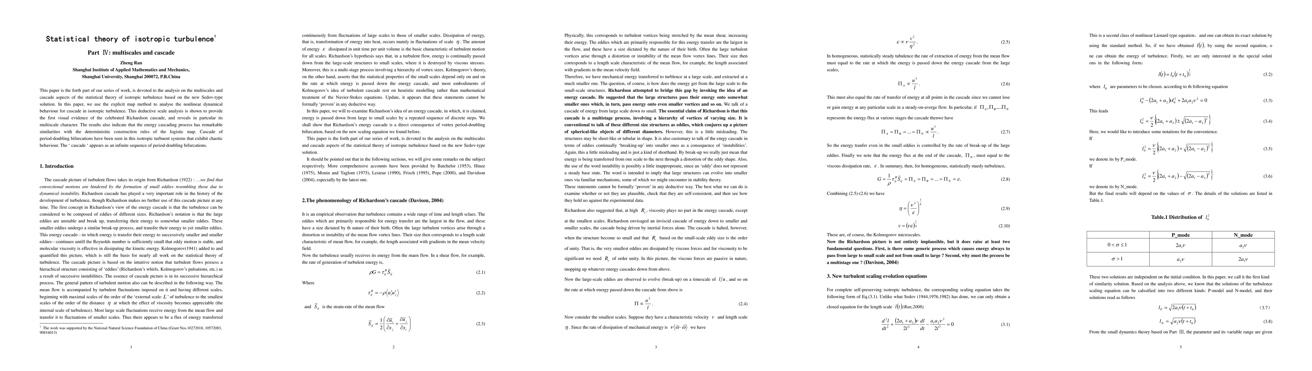 This paper is the forth part of our series of work, is devoted to the analysis on the multiscales and cascade aspects of the statistical theory of isotropic turbulence based on the new Sedov-type solution. In this paper, we use the explicit map method to analyse the nonlinear dynamical behaviour for cascade in isotorpic turbulence. This deductive scale analysis is shown to provide the first visual evidence of the celebrated Richardson cascade, and reveals in partcular its multiscale character. The results also indicate that the energy cascading process has remarkable similarities with the determinisitic construction rules of the logistic map. Cascade of period-doubling bifurcations have been seen in this isotropic turbuent systems that exhibit chaotic behaviour. The 'cascade' appears as an infinite sequence of period-doubling bifurcations.