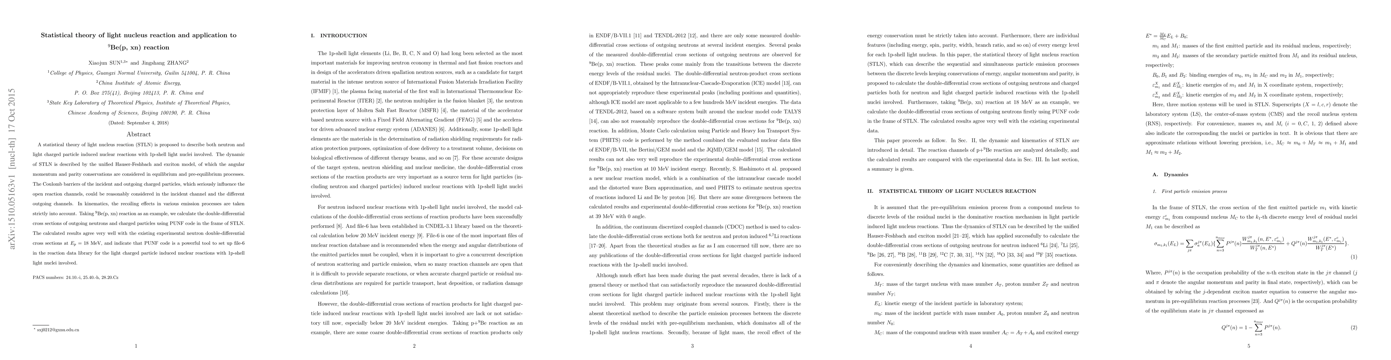 The paper proposes a statistical theory of light nucleus reaction (STLN) for 1p-shell light nuclei, combining the Hauser-Feshbach and exciton models to describe neutron and charged particle reactions. The PUNF code, applied to the $^9$Be(p, xn) reaction, accurately predicts double-differential cross sections, validating its utility for reaction data libraries.