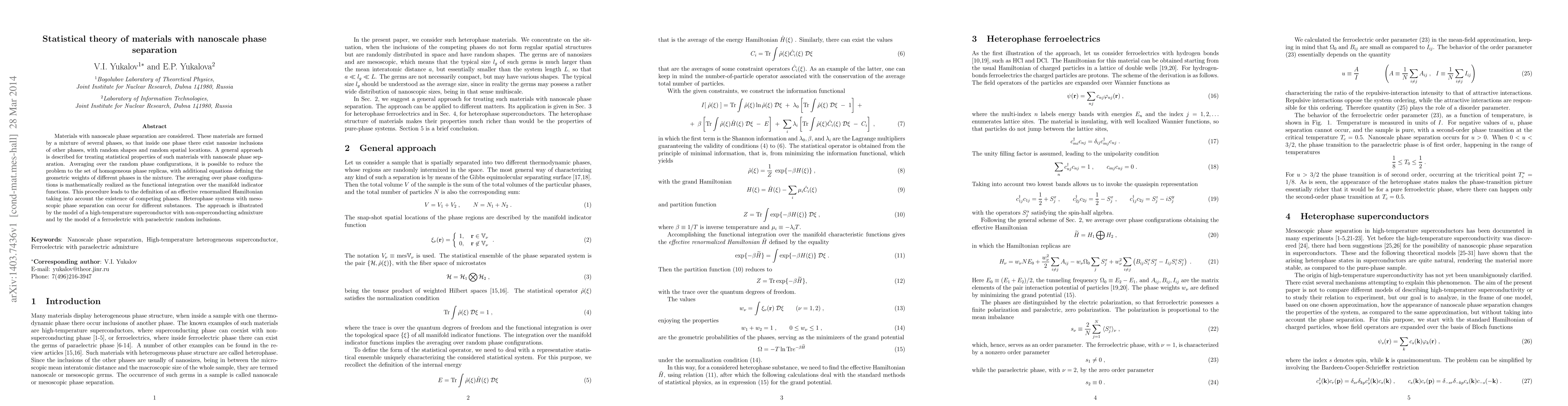 This paper develops a statistical theory for materials with nanoscale phase separation, where multiple phases coexist with nanosize inclusions. It introduces a method to average over random phase configurations, leading to an effective renormalized Hamiltonian that accounts for competing phases, illustrated by models of high-temperature superconductors and ferroelectrics.