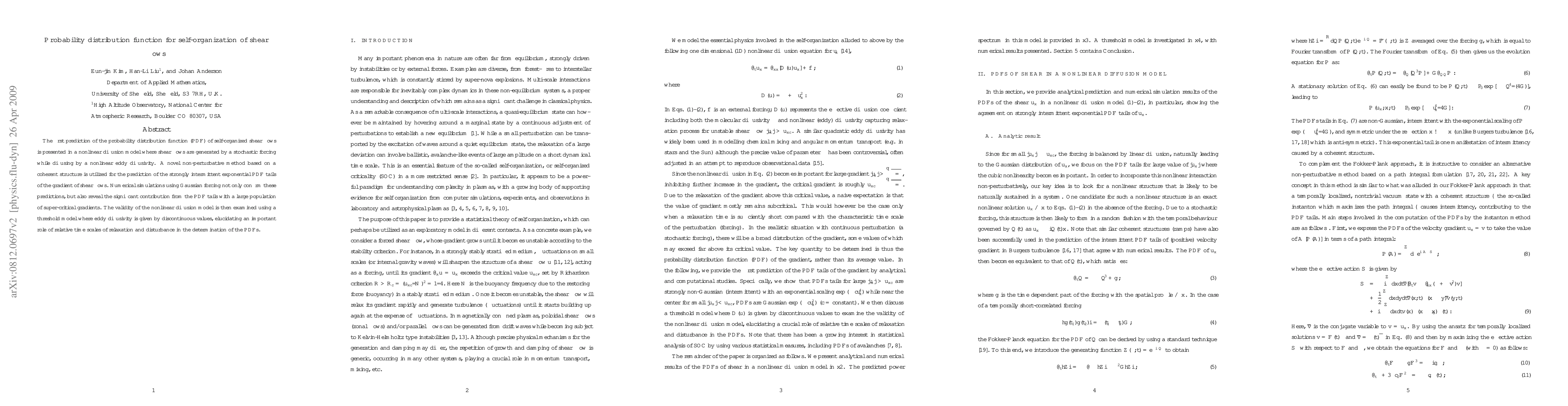 This paper introduces a novel non-perturbative method to predict the probability distribution function for self-organization in shear flows, revealing strong intermittency and exponential tails. Numerical simulations corroborate these predictions, suggesting a high likelihood of supercritical states due to stochastic perturbations in various systems.