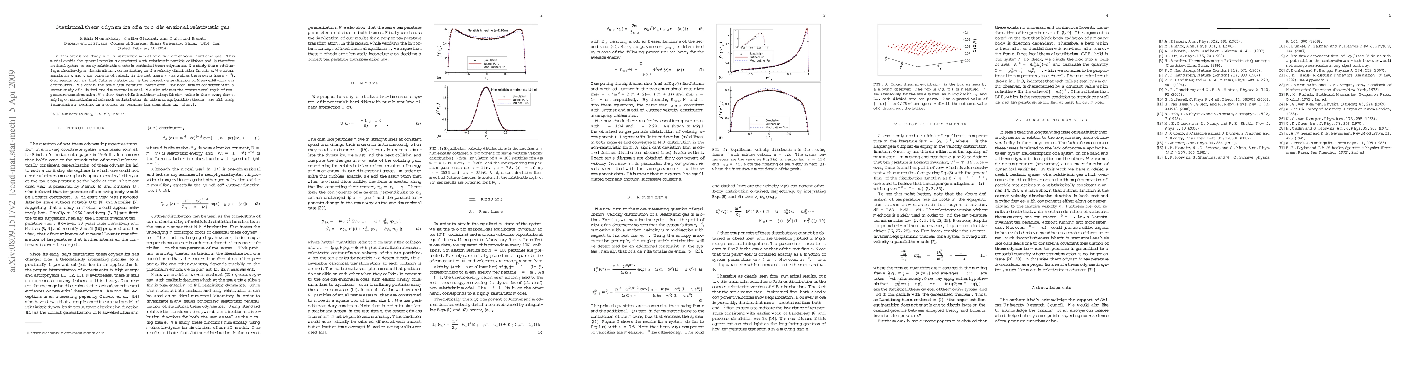 In this article we study a fully relativistic model of a two dimensional hard-disk gas. This model avoids the general problems associated with relativistic particle collisions and is therefore an ideal system to study relativistic effects in statistical thermodynamics. We study this model using molecular-dynamics simulation, concentrating on the velocity distribution functions. We obtain results for $x$ and $y$ components of velocity in the rest frame ($\Gamma$) as well as the moving frame ($\Gamma'$). Our results confirm that J\"{u}ttner distribution is the correct generalization of Maxwell-Boltzmann distribution. We obtain the same "temperature" parameter $\beta$ for both frames consistent with a recent study of a limited one-dimensional model. We also address the controversial topic of temperature transformation. We show that while local thermal equilibrium holds in the moving frame, relying on statistical methods such as distribution functions or equipartition theorem are ultimately inconclusive in deciding on a correct temperature transformation law (if any).