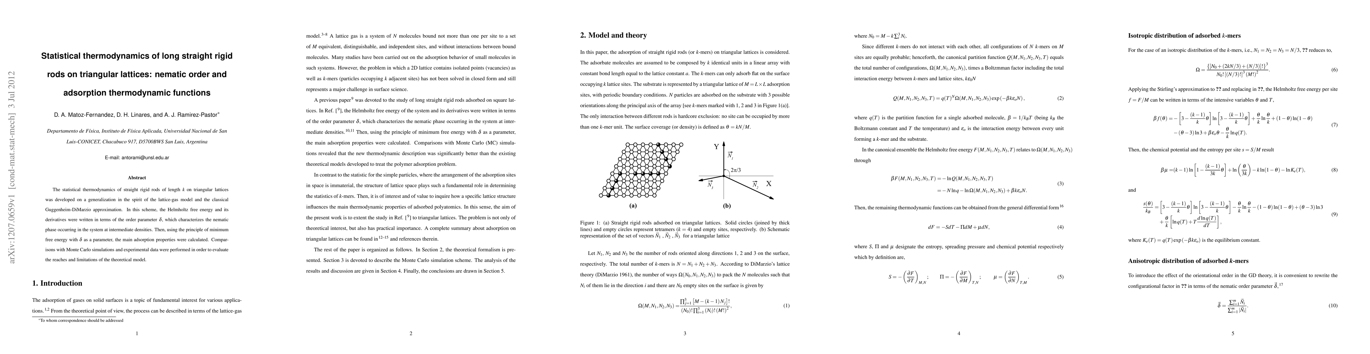 The paper presents a statistical thermodynamics model for long rigid rods on triangular lattices, introducing an order parameter to describe nematic phase formation at intermediate densities. The model's adsorption properties were derived and validated through comparisons with Monte Carlo simulations and experimental data, offering insights into the system's behavior.