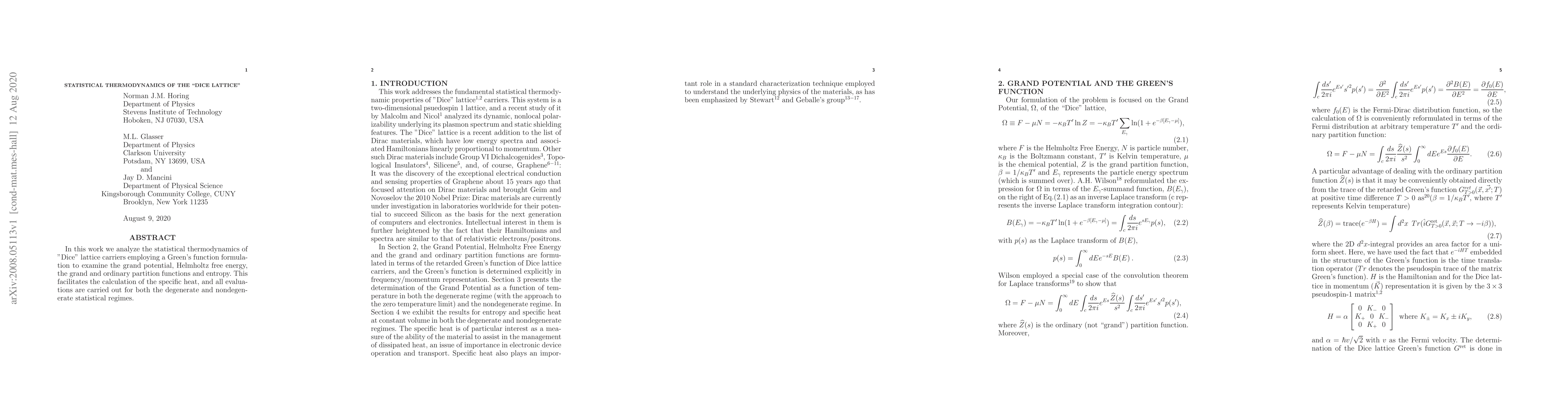 This paper investigates the statistical thermodynamics of carriers in a diced lattice using a Greens function approach, calculating the grand potential, Helmholtz free energy, partition functions, and entropy, and determining the specific heat in both degenerate and nondegenerate regimes.
