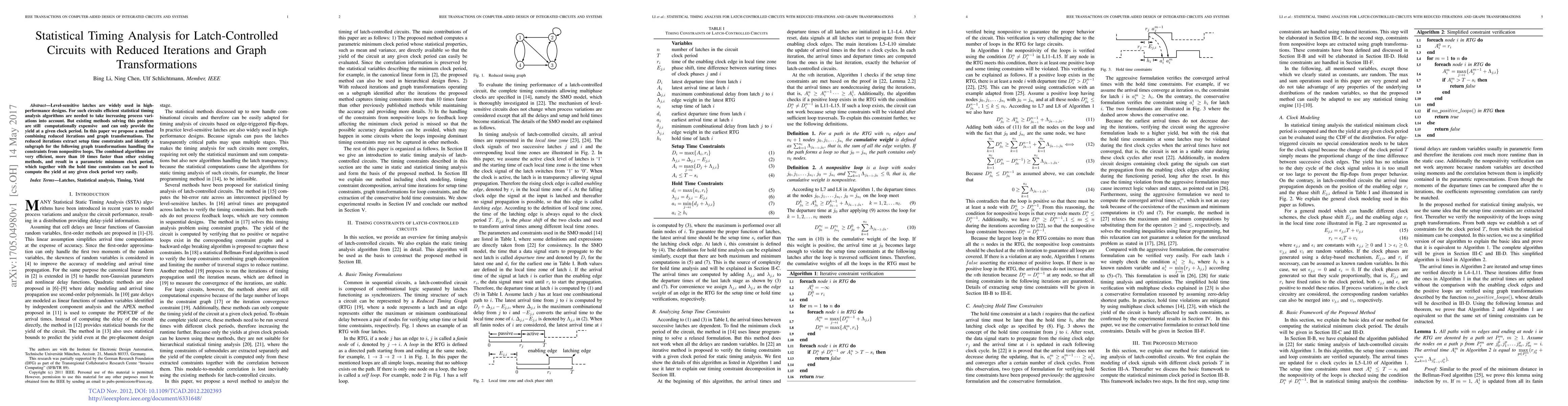 This paper proposes an efficient statistical timing analysis method for latch-controlled circuits, combining reduced iterations and graph transformations to handle setup time constraints and nonpositive loops. The new approach is over 10 times faster than existing methods and provides a parametric minimum clock period for easy yield computation at any clock period.