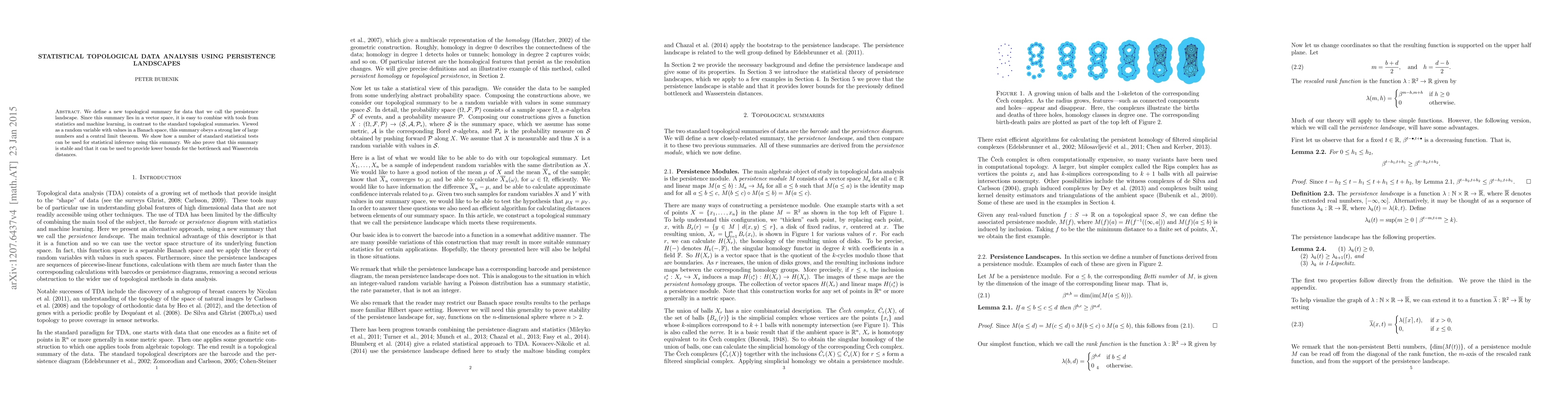 This paper introduces the persistence landscape as a new topological summary for data, enabling integration with statistical and machine learning tools. It demonstrates the landscape's stability, applicability to statistical inference, and its utility in providing lower bounds for bottleneck and Wasserstein distances.