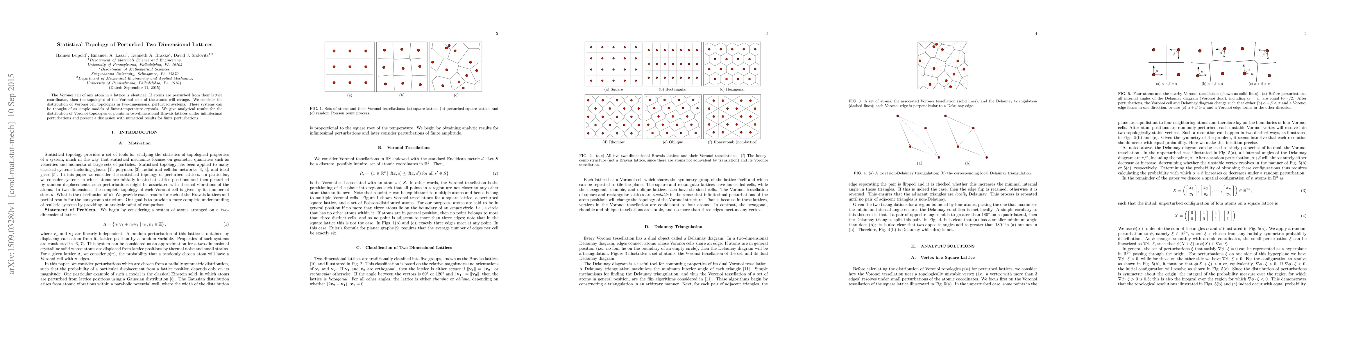 The Voronoi cell of any atom in a lattice is identical. If atoms are perturbed from their lattice coordinates, then the topologies of the Voronoi cells of the atoms will change. We consider the distribution of Voronoi cell topologies in two-dimensional perturbed systems. These systems can be thought of as simple models of finite-temperature crystals. We give analytical results for the distribution of Voronoi topologies of points in two-dimensional Bravais lattices under infinitesimal perturbations and present a discussion with numerical results for finite perturbations.