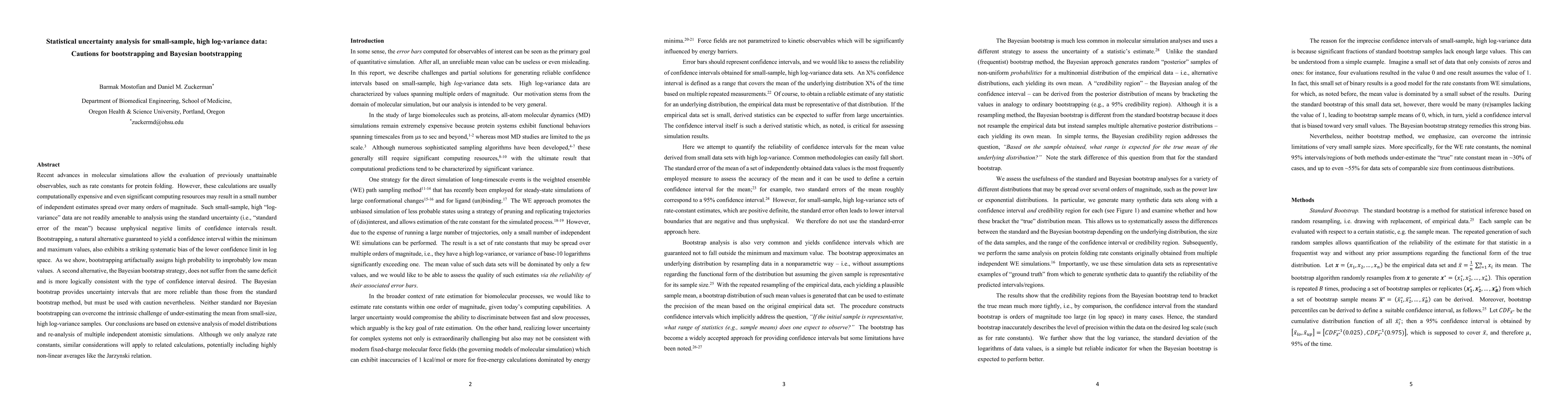 Recent advances in molecular simulations allow the evaluation of previously unattainable observables, such as rate constants for protein folding. However, these calculations are usually computationally expensive and even significant computing resources may result in a small number of independent estimates spread over many orders of magnitude. Such small-sample, high "log-variance" data are not readily amenable to analysis using the standard uncertainty (i.e., "standard error of the mean") because unphysical negative limits of confidence intervals result. Bootstrapping, a natural alternative guaranteed to yield a confidence interval within the minimum and maximum values, also exhibits a striking systematic bias of the lower confidence limit in log space. As we show, bootstrapping artifactually assigns high probability to improbably low mean values. A second alternative, the Bayesian bootstrap strategy, does not suffer from the same deficit and is more logically consistent with the type of confidence interval desired. The Bayesian bootstrap provides uncertainty intervals that are more reliable than those from the standard bootstrap method, but must be used with caution nevertheless. Neither standard nor Bayesian bootstrapping can overcome the intrinsic challenge of under-estimating the mean from small-size, high log-variance samples. Our conclusions are based on extensive analysis of model distributions and re-analysis of multiple independent atomistic simulations. Although we only analyze rate constants, similar considerations will apply to related calculations, potentially including highly non-linear averages like the Jarzynski relation.