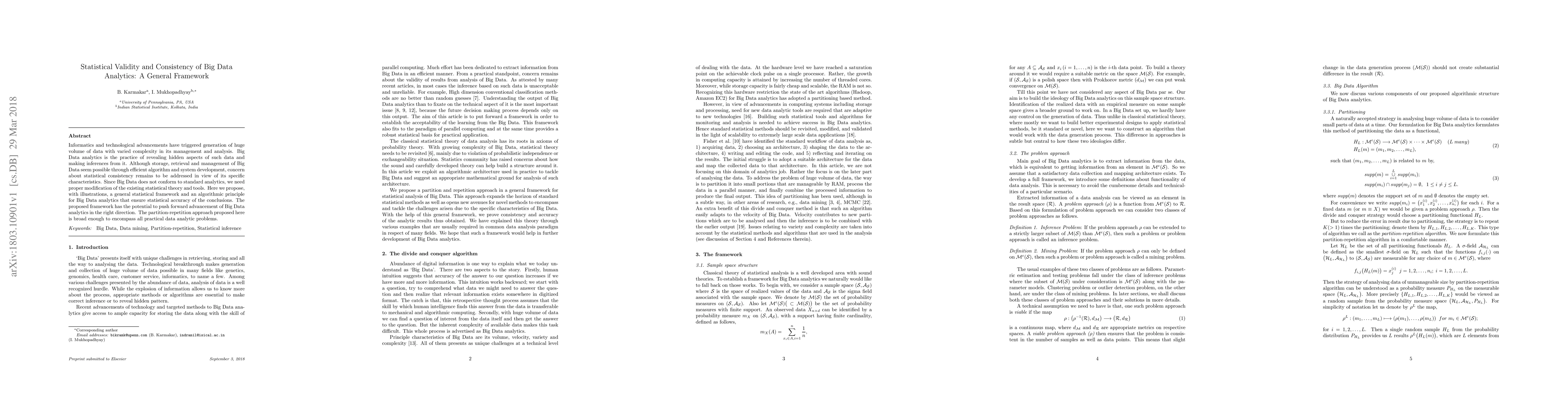 This paper proposes a general statistical framework and algorithmic principle for Big Data analytics to address statistical consistency issues, ensuring accurate conclusions. The partition-repetition approach is presented as a broad solution to various practical data analytic problems.