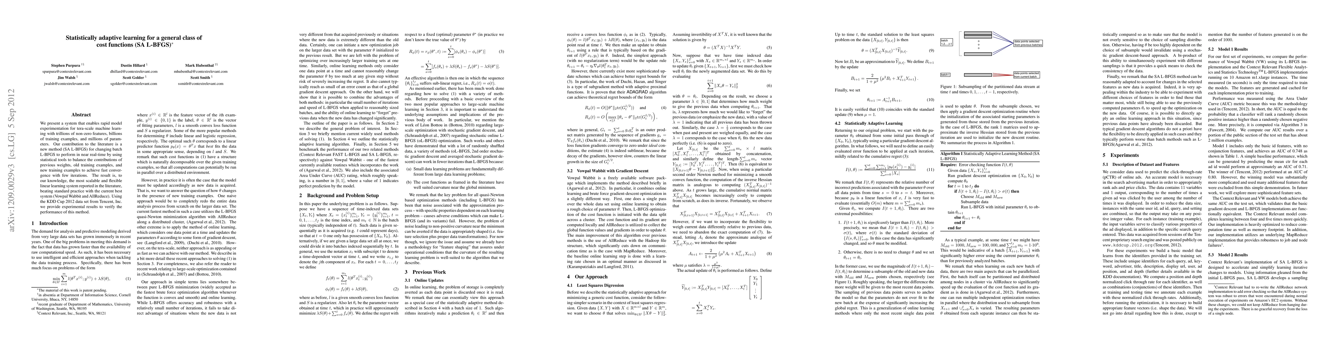 We present a system that enables rapid model experimentation for tera-scale machine learning with trillions of non-zero features, billions of training examples, and millions of parameters. Our contribution to the literature is a new method (SA L-BFGS) for changing batch L-BFGS to perform in near real-time by using statistical tools to balance the contributions of previous weights, old training examples, and new training examples to achieve fast convergence with few iterations. The result is, to our knowledge, the most scalable and flexible linear learning system reported in the literature, beating standard practice with the current best system (Vowpal Wabbit and AllReduce). Using the KDD Cup 2012 data set from Tencent, Inc. we provide experimental results to verify the performance of this method.