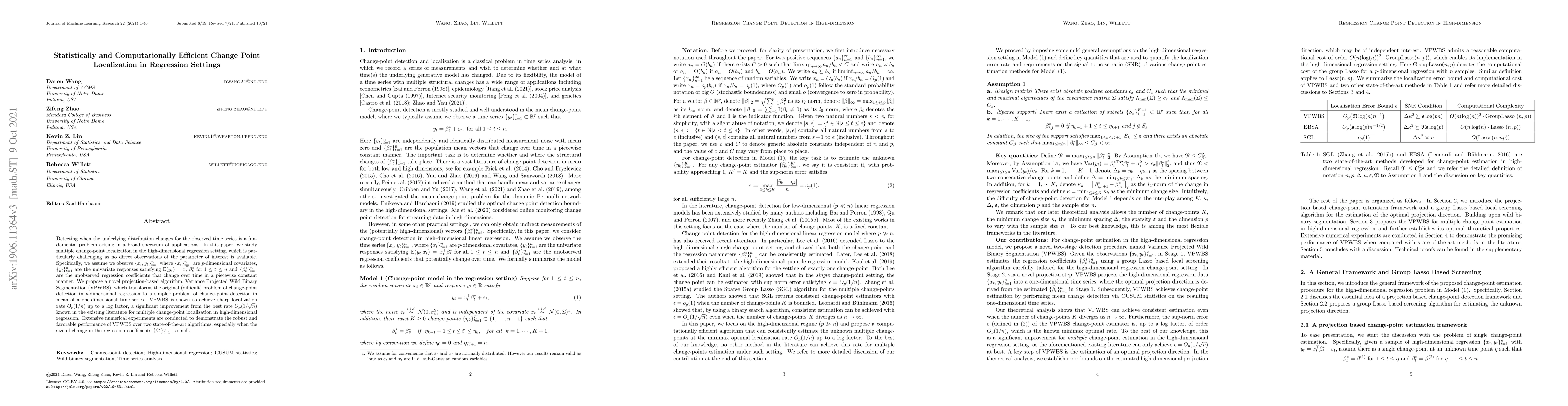 This paper proposes a novel algorithm, Variance Projected Wild Binary Segmentation (VPWBS), for detecting multiple change points in high-dimensional regression settings where the regression coefficients change over time. VPWBS transforms the problem into a simpler one-dimensional time series, achieving a sharper localization rate of $O_p(1/n)$ compared to existing methods.