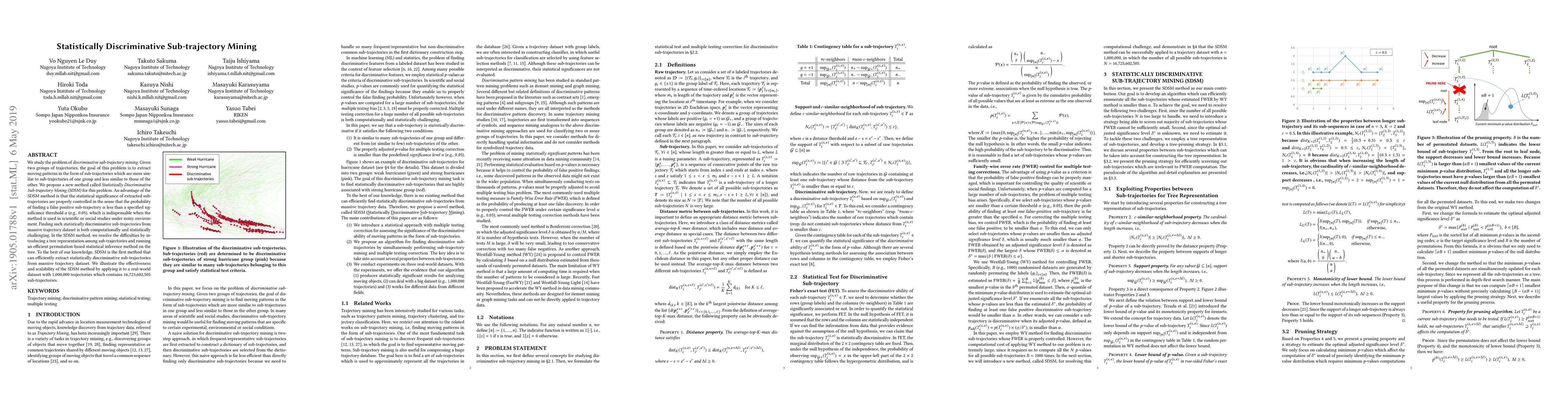 This paper introduces a new method called Statistically Discriminative Sub-trajectory Mining (SDSM) that can efficiently extract sub-trajectories from massive trajectory datasets with controlled statistical significance.