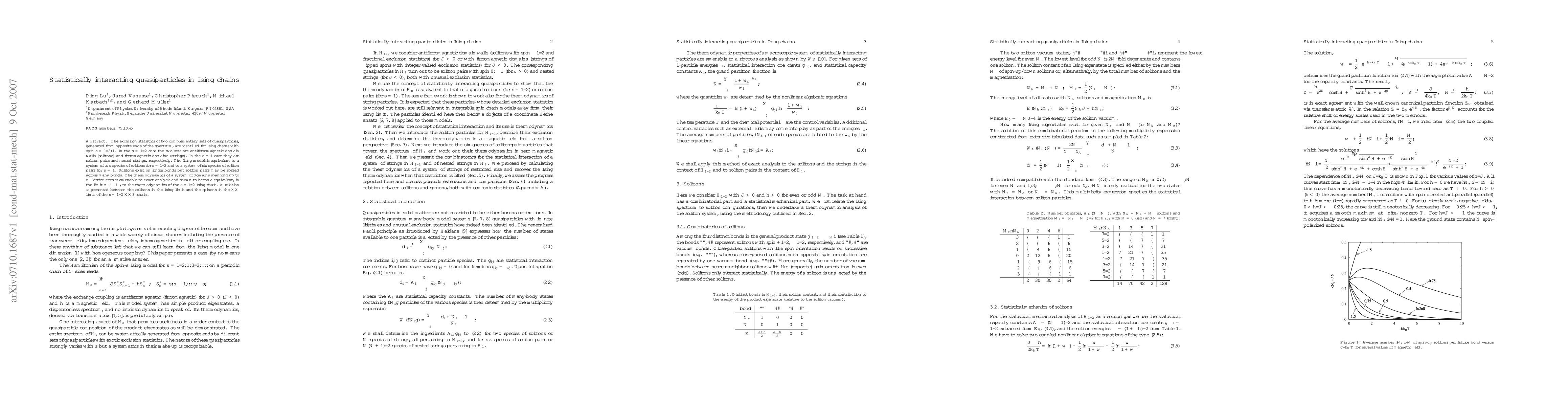 This paper investigates the exclusion statistics of quasiparticles in Ising chains, identifying two complementary sets for spin s=1/2 and s=1. It reveals the thermodynamic equivalence of large domain systems to the s=1/2 Ising chain and connects solitons in the Ising limit to spinons in the XX limit of the s=1/2 XXZ chain.
