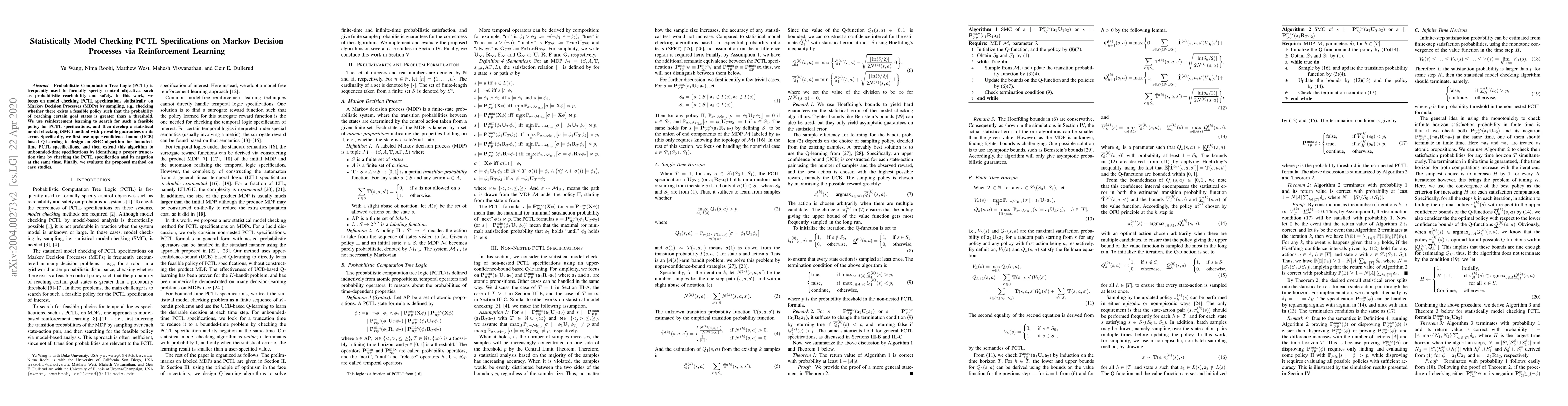 This paper proposes a statistical model checking method for Probabilistic Computation Tree Logic (PCTL) specifications on Markov Decision Processes (MDPs) using reinforcement learning. It employs upper-confidence-bound (UCB) based Q-learning to find a feasible policy and extends the approach to handle both bounded and unbounded time specifications, providing a method with provable error guarantees.