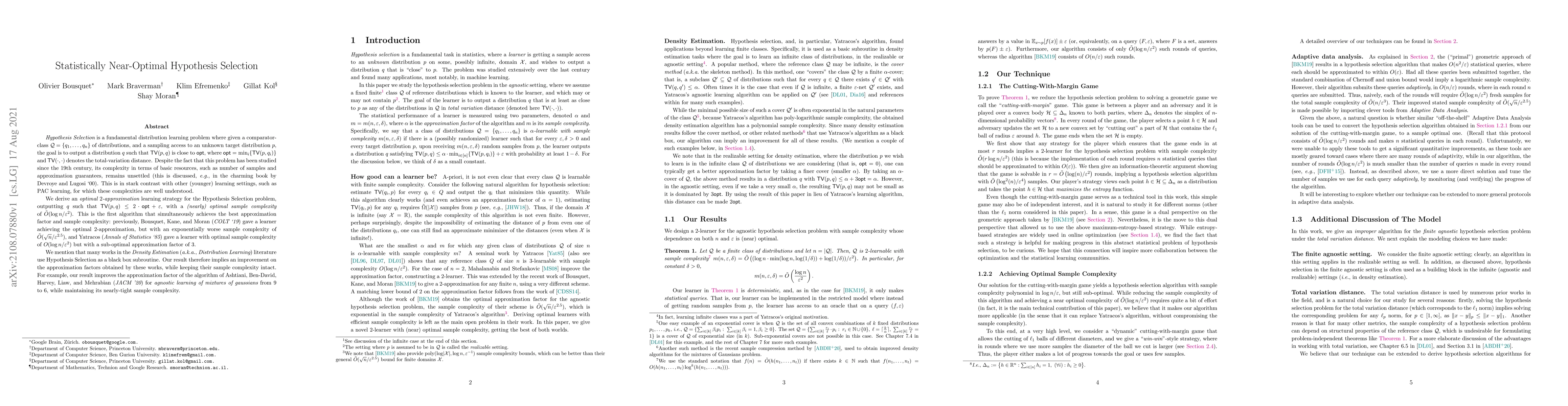 Hypothesis Selection is a fundamental distribution learning problem where given a comparator-class $Q=\{q_1,\ldots, q_n\}$ of distributions, and a sampling access to an unknown target distribution $p$, the goal is to output a distribution $q$ such that $\mathsf{TV}(p,q)$ is close to $opt$, where $opt = \min_i\{\mathsf{TV}(p,q_i)\}$ and $\mathsf{TV}(\cdot, \cdot)$ denotes the total-variation distance. Despite the fact that this problem has been studied since the 19th century, its complexity in terms of basic resources, such as number of samples and approximation guarantees, remains unsettled (this is discussed, e.g., in the charming book by Devroye and Lugosi `00). This is in stark contrast with other (younger) learning settings, such as PAC learning, for which these complexities are well understood. We derive an optimal $2$-approximation learning strategy for the Hypothesis Selection problem, outputting $q$ such that $\mathsf{TV}(p,q) \leq2 \cdot opt + \eps$, with a (nearly) optimal sample complexity of~$\tilde O(\log n/\epsilon^2)$. This is the first algorithm that simultaneously achieves the best approximation factor and sample complexity: previously, Bousquet, Kane, and Moran (COLT `19) gave a learner achieving the optimal $2$-approximation, but with an exponentially worse sample complexity of $\tilde O(\sqrt{n}/\epsilon^{2.5})$, and Yatracos~(Annals of Statistics `85) gave a learner with optimal sample complexity of $O(\log n /\epsilon^2)$ but with a sub-optimal approximation factor of $3$.