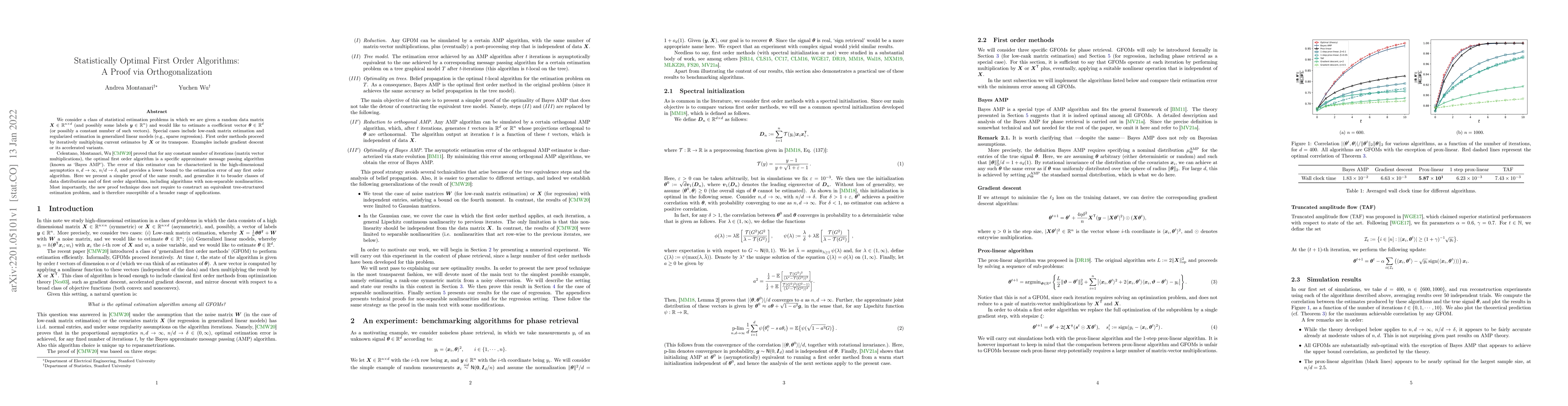 We consider a class of statistical estimation problems in which we are given a random data matrix ${\boldsymbol X}\in {\mathbb R}^{n\times d}$ (and possibly some labels ${\boldsymbol y}\in{\mathbb R}^n$) and would like to estimate a coefficient vector ${\boldsymbol \theta}\in{\mathbb R}^d$ (or possibly a constant number of such vectors). Special cases include low-rank matrix estimation and regularized estimation in generalized linear models (e.g., sparse regression). First order methods proceed by iteratively multiplying current estimates by ${\boldsymbol X}$ or its transpose. Examples include gradient descent or its accelerated variants. Celentano, Montanari, Wu proved that for any constant number of iterations (matrix vector multiplications), the optimal first order algorithm is a specific approximate message passing algorithm (known as `Bayes AMP'). The error of this estimator can be characterized in the high-dimensional asymptotics $n,d\to\infty$, $n/d\to\delta$, and provides a lower bound to the estimation error of any first order algorithm. Here we present a simpler proof of the same result, and generalize it to broader classes of data distributions and of first order algorithms, including algorithms with non-separable nonlinearities. Most importantly, the new proof technique does not require to construct an equivalent tree-structured estimation problem, and is therefore susceptible of a broader range of applications.