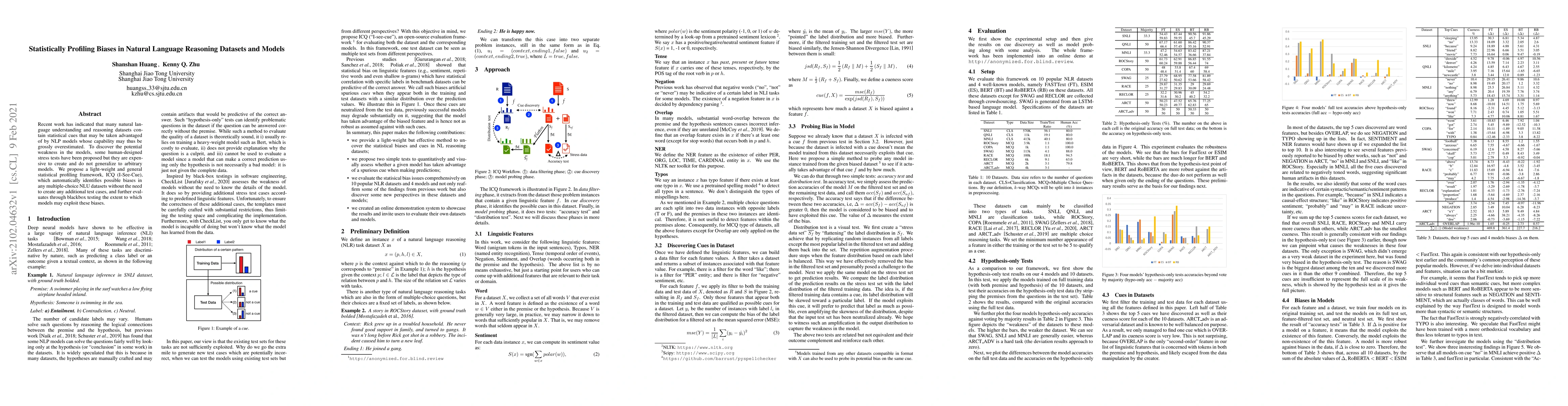 This paper introduces ICQ, a statistical profiling framework that automatically detects biases in natural language understanding datasets without requiring additional test cases, and assesses how models exploit these biases through blackbox testing. The proposed method aims to identify potential weaknesses in NLP models that may be overestimating their capabilities due to dataset biases.