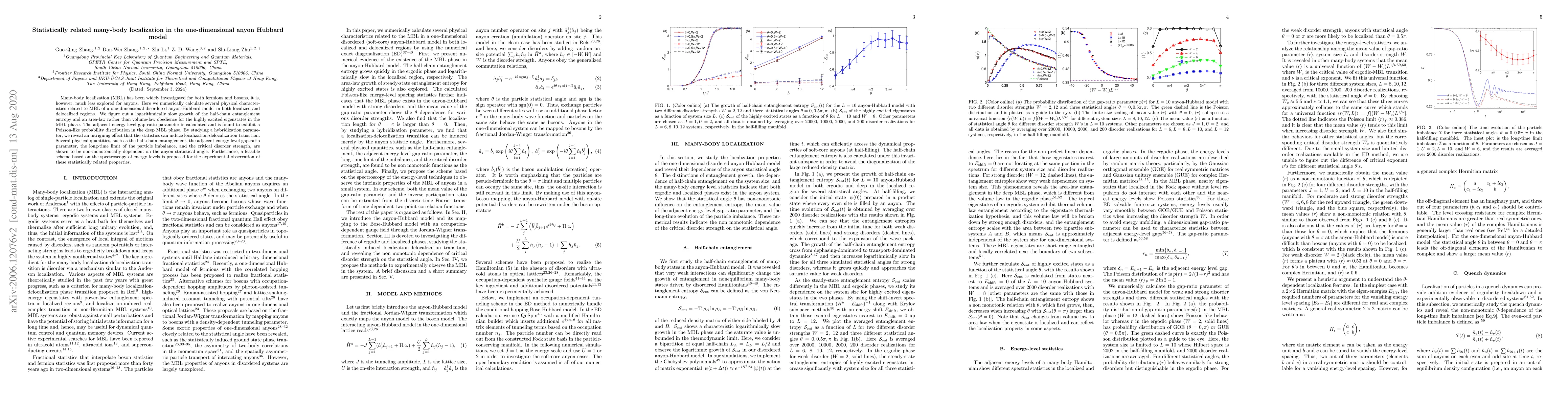 This paper investigates many-body localization (MBL) in a one-dimensional disordered anyon-Hubbard model, revealing logarithmically slow entanglement growth and a Poisson-like distribution of energy level gaps in the MBL phase. It also demonstrates a localization-delocalization transition induced by statistical effects and proposes a spectroscopic method for experimental observation.