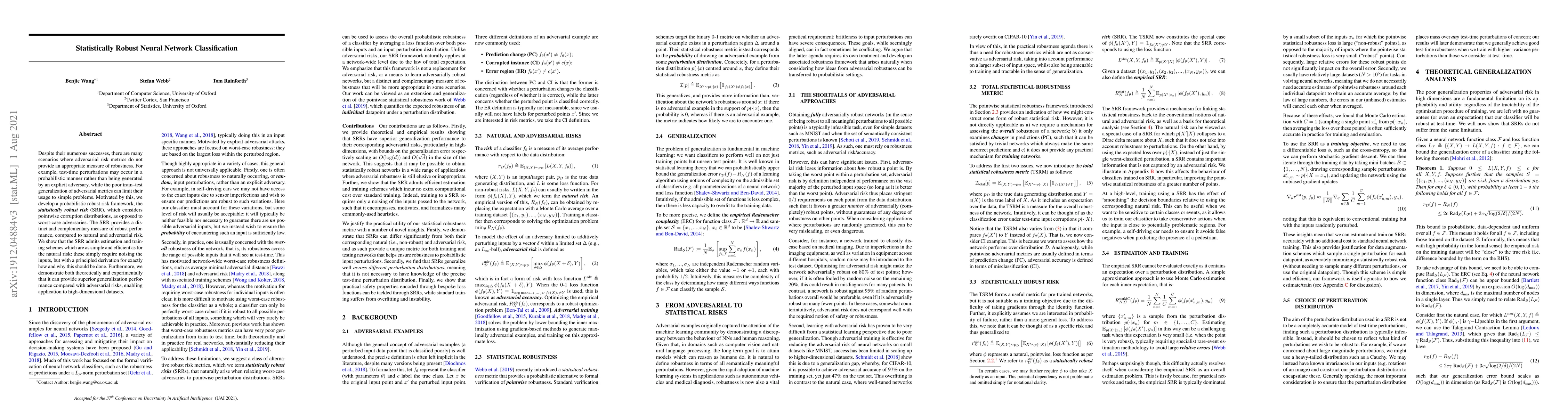 Despite their numerous successes, there are many scenarios where adversarial risk metrics do not provide an appropriate measure of robustness. For example, test-time perturbations may occur in a probabilistic manner rather than being generated by an explicit adversary, while the poor train--test generalization of adversarial metrics can limit their usage to simple problems. Motivated by this, we develop a probabilistic robust risk framework, the statistically robust risk (SRR), which considers pointwise corruption distributions, as opposed to worst-case adversaries. The SRR provides a distinct and complementary measure of robust performance, compared to natural and adversarial risk. We show that the SRR admits estimation and training schemes which are as simple and efficient as for the natural risk: these simply require noising the inputs, but with a principled derivation for exactly how and why this should be done. Furthermore, we demonstrate both theoretically and experimentally that it can provide superior generalization performance compared with adversarial risks, enabling application to high-dimensional datasets.