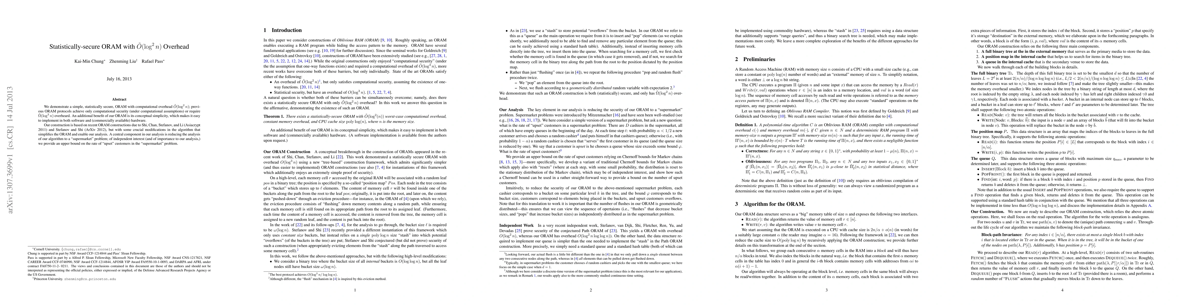 We demonstrate a simple, statistically secure, ORAM with computational overhead $\tilde{O}(\log^2 n)$; previous ORAM protocols achieve only computational security (under computational assumptions) or require $\tilde{\Omega}(\log^3 n)$ overheard. An additional benefit of our ORAM is its conceptual simplicity, which makes it easy to implement in both software and (commercially available) hardware. Our construction is based on recent ORAM constructions due to Shi, Chan, Stefanov, and Li (Asiacrypt 2011) and Stefanov and Shi (ArXiv 2012), but with some crucial modifications in the algorithm that simplifies the ORAM and enable our analysis. A central component in our analysis is reducing the analysis of our algorithm to a "supermarket" problem; of independent interest (and of importance to our analysis,) we provide an upper bound on the rate of "upset" customers in the "supermarket" problem.
