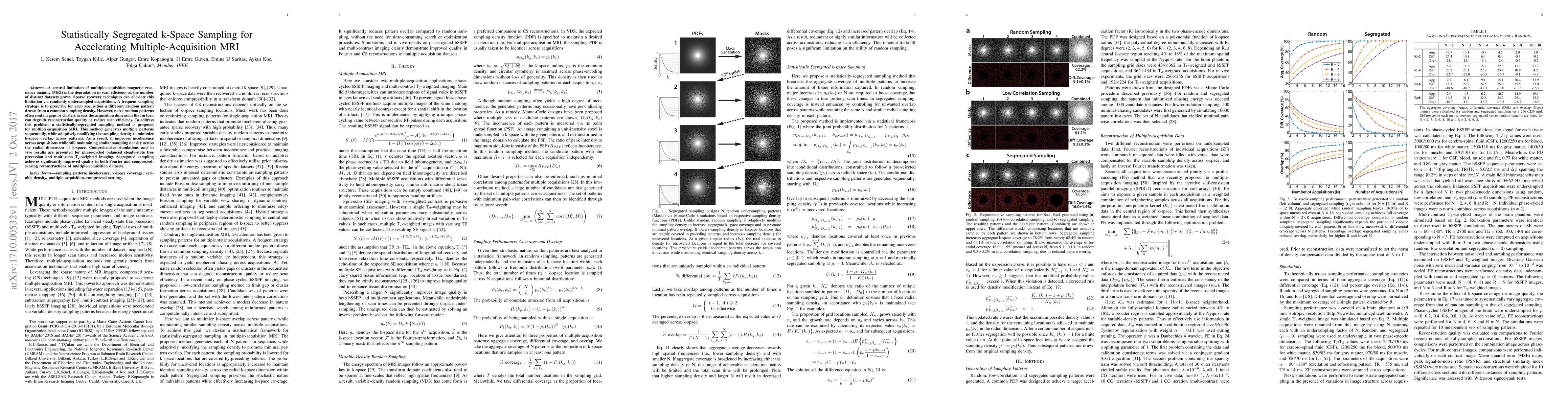 This paper proposes a statistically-segregated k-space sampling method for multiple-acquisition MRI to improve scan efficiency and reconstruction quality by minimizing k-space overlap across different acquisition patterns. The method adaptively modifies sampling density to achieve better incoherence while maintaining uniform density in k-space, resulting in superior reconstructions in both Fourier and compressed-sensing methods.
