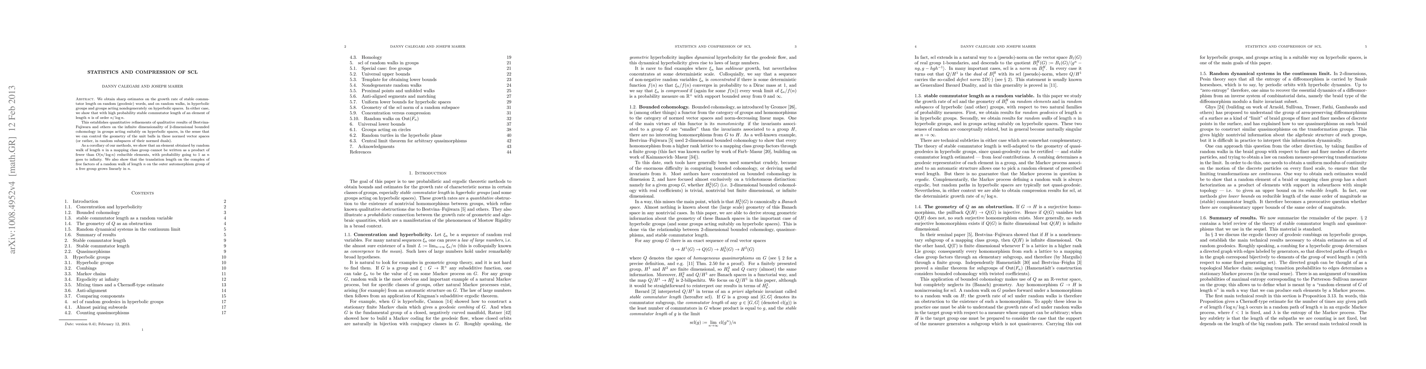 We obtain sharp estimates on the growth rate of stable commutator length on random (geodesic) words, and on random walks, in hyperbolic groups and groups acting nondegenerately on hyperbolic spaces. In either case, we show that with high probability stable commutator length of an element of length $n$ is of order $n/\log{n}$. This establishes quantitative refinements of qualitative results of Bestvina-Fujiwara and others on the infinite dimensionality of 2-dimensional bounded cohomology in groups acting suitably on hyperbolic spaces, in the sense that we can control the geometry of the unit balls in these normed vector spaces (or rather, in random subspaces of their normed duals). As a corollary of our methods, we show that an element obtained by random walk of length $n$ in a mapping class group cannot be written as a product of fewer than $O(n/\log{n})$ reducible elements, with probability going to 1 as $n$ goes to infinity. We also show that the translation length on the complex of free factors of a random walk of length $n$ on the outer automorphism group of a free group grows linearly in $n$.