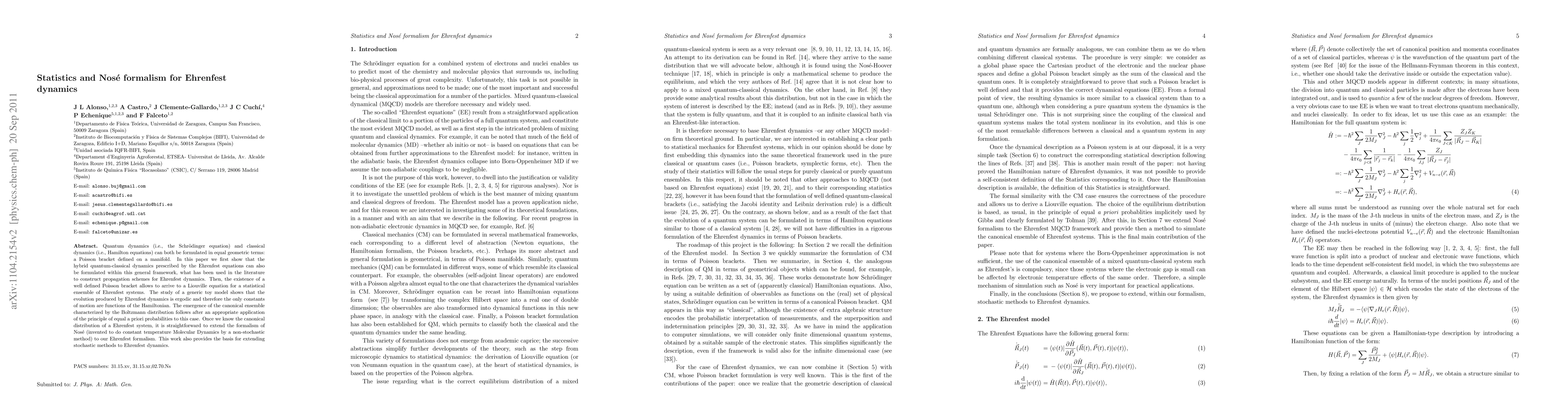 Quantum dynamics (i.e., the Schr\"odinger equation) and classical dynamics (i.e., Hamilton equations) can both be formulated in equal geometric terms: a Poisson bracket defined on a manifold. In this paper we first show that the hybrid quantum-classical dynamics prescribed by the Ehrenfest equations can also be formulated within this general framework, what has been used in the literature to construct propagation schemes for Ehrenfest dynamics. Then, the existence of a well defined Poisson bracket allows to arrive to a Liouville equation for a statistical ensemble of Ehrenfest systems. The study of a generic toy model shows that the evolution produced by Ehrenfest dynamics is ergodic and therefore the only constants of motion are functions of the Hamiltonian. The emergence of the canonical ensemble characterized by the Boltzmann distribution follows after an appropriate application of the principle of equal a priori probabilities to this case. Once we know the canonical distribution of a Ehrenfest system, it is straightforward to extend the formalism of Nos\'e (invented to do constant temperature Molecular Dynamics by a non-stochastic method) to our Ehrenfest formalism. This work also provides the basis for extending stochastic methods to Ehrenfest dynamics.