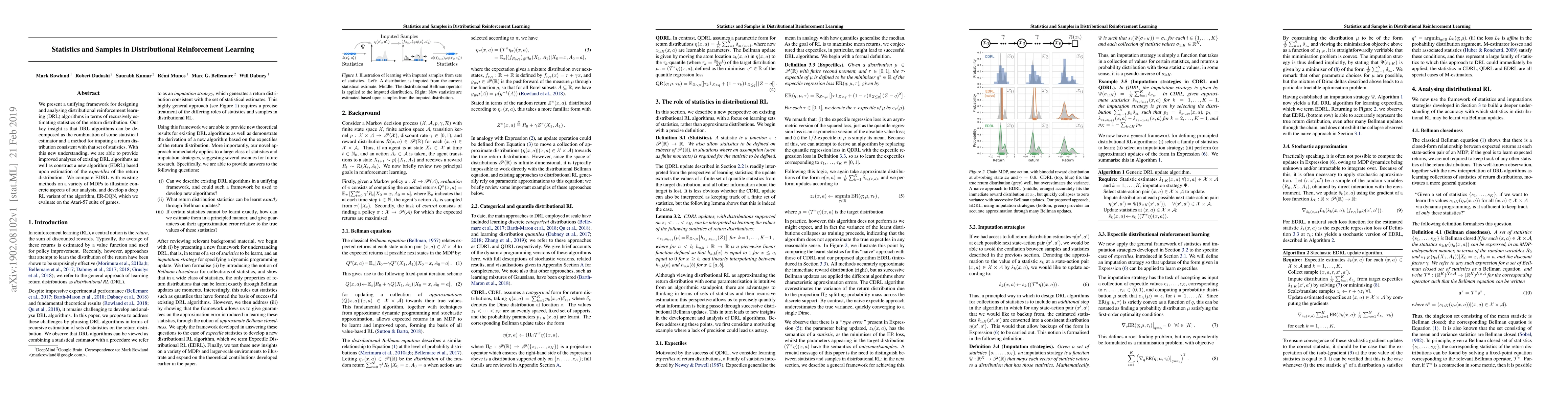 We present a unifying framework for designing and analysing distributional reinforcement learning (DRL) algorithms in terms of recursively estimating statistics of the return distribution. Our key insight is that DRL algorithms can be decomposed as the combination of some statistical estimator and a method for imputing a return distribution consistent with that set of statistics. With this new understanding, we are able to provide improved analyses of existing DRL algorithms as well as construct a new algorithm (EDRL) based upon estimation of the expectiles of the return distribution. We compare EDRL with existing methods on a variety of MDPs to illustrate concrete aspects of our analysis, and develop a deep RL variant of the algorithm, ER-DQN, which we evaluate on the Atari-57 suite of games.