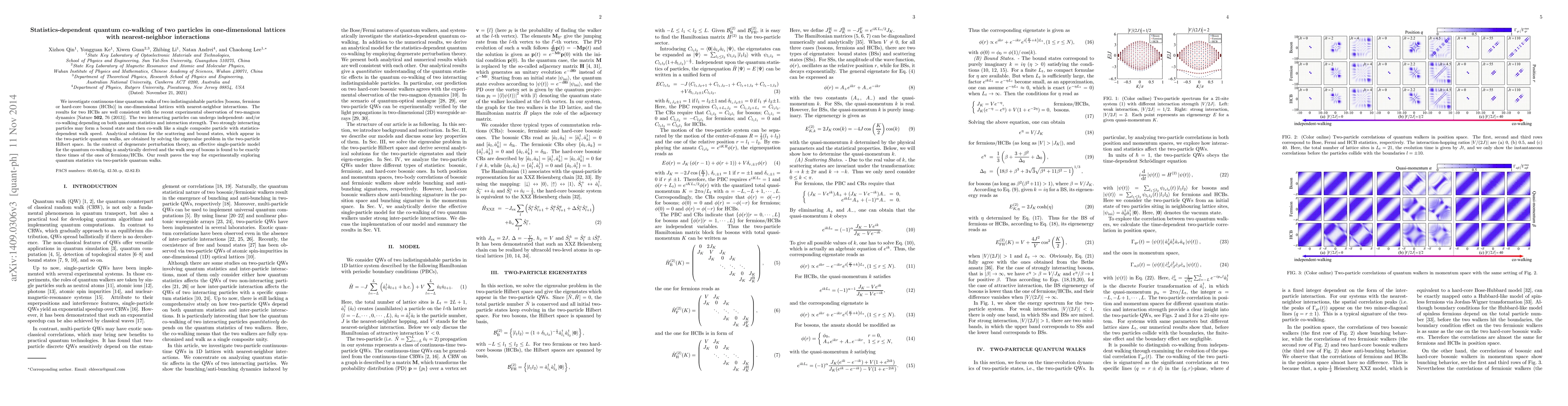 This paper explores the quantum co-walking behavior of two indistinguishable particles in one-dimensional lattices with nearest-neighbor interactions, revealing statistics-dependent walk speeds and the formation of bound states. The analytical results align with recent experimental observations of two-magnon dynamics in bosonic systems.