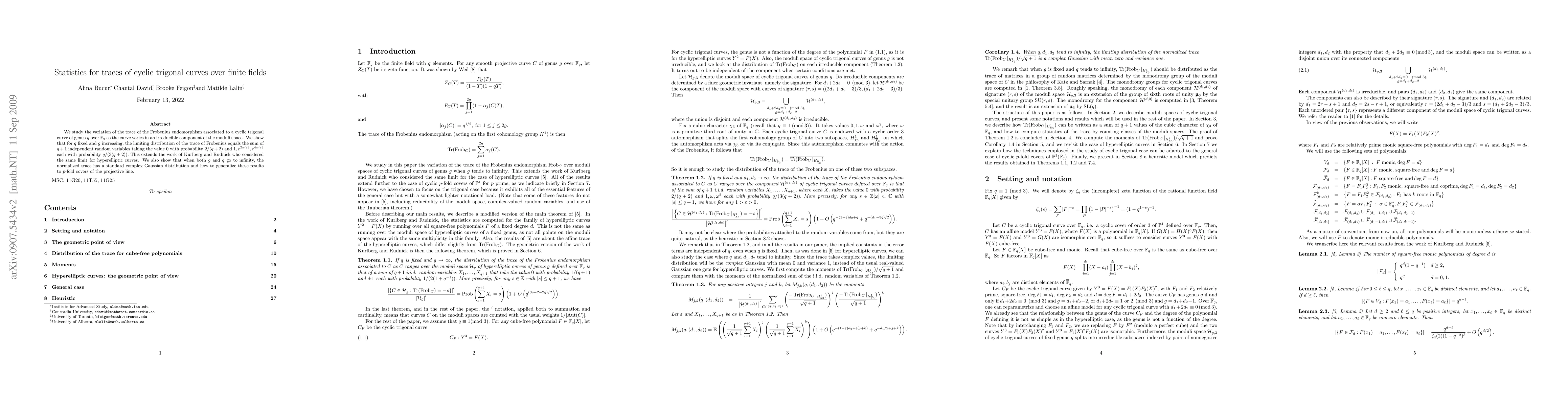 We study the variation of the trace of the Frobenius endomorphism associated to a cyclic trigonal curve of genus g over a field of q elements as the curve varies in an irreducible component of the moduli space. We show that for q fixed and g increasing, the limiting distribution of the trace of the Frobenius equals the sum of q+1 independent random variables taking the value 0 with probability 2/(q+2) and 1, e^{(2pi i)/3}, e^{(4pi i)/3} each with probability q/(3(q+2)). This extends the work of Kurlberg and Rudnick who considered the same limit for hyperelliptic curves. We also show that when both g and q go to infinity, the normalized trace has a standard complex Gaussian distribution and how to generalize these results to p-fold covers of the projective line.