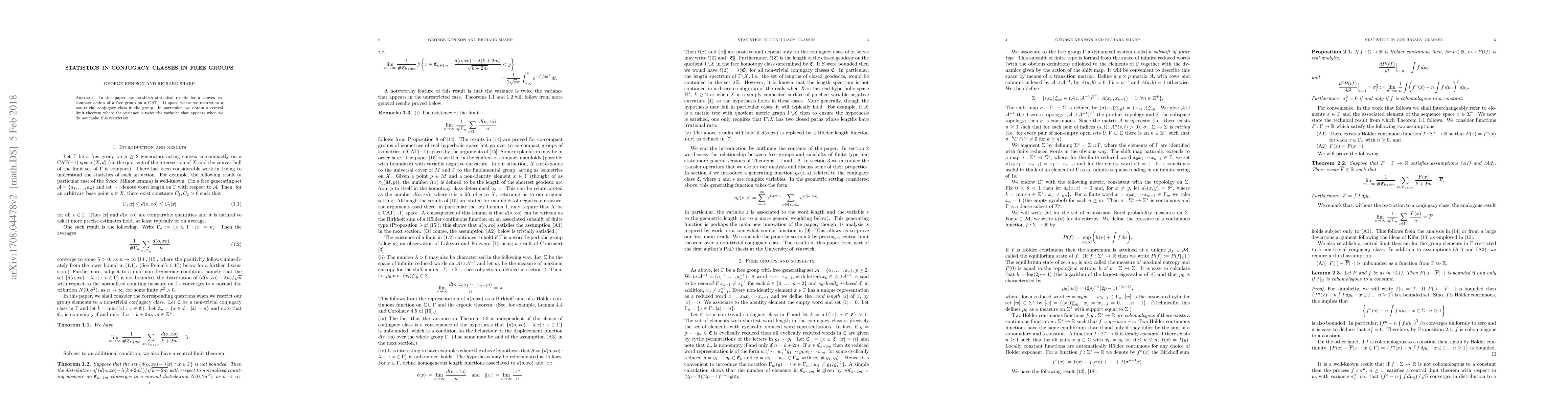 In this paper, we establish statistical results for a convex co-compact action of a free group on a CAT($-1$) space where we restrict to a non-trivial conjugacy class in the group. In particular, we obtain a central limit theorem where the variance is twice the variance that appears when we do not make this restriction.